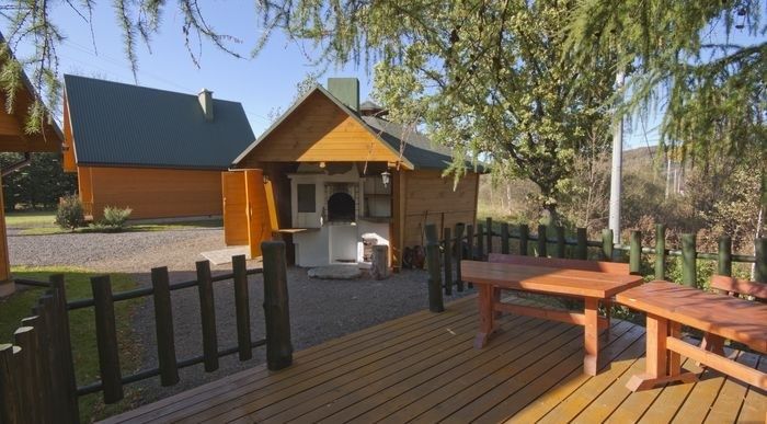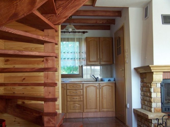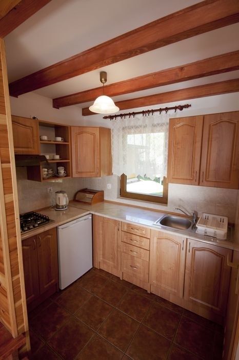 Każdy z domków wyposażony jest również w TV, lodówkę, kuchenkę gazową. Istnieje możliwość samodzielnego przyrządzania posiłków w pełni wyposażonej kuchni. W sezonie zimowym zapewniamy rozpałkę oraz drewno do kominka.