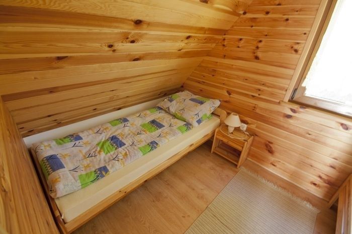 Nasza propozycja zakwaterowania dotyczy pobytu w komfortowych 6-osobowych domkach, zawierających 2 pokoje o przeznaczeniu sypialnym na poddaszu oraz salon z kominkiem, a także kuchnię i łazienkę na parterze.