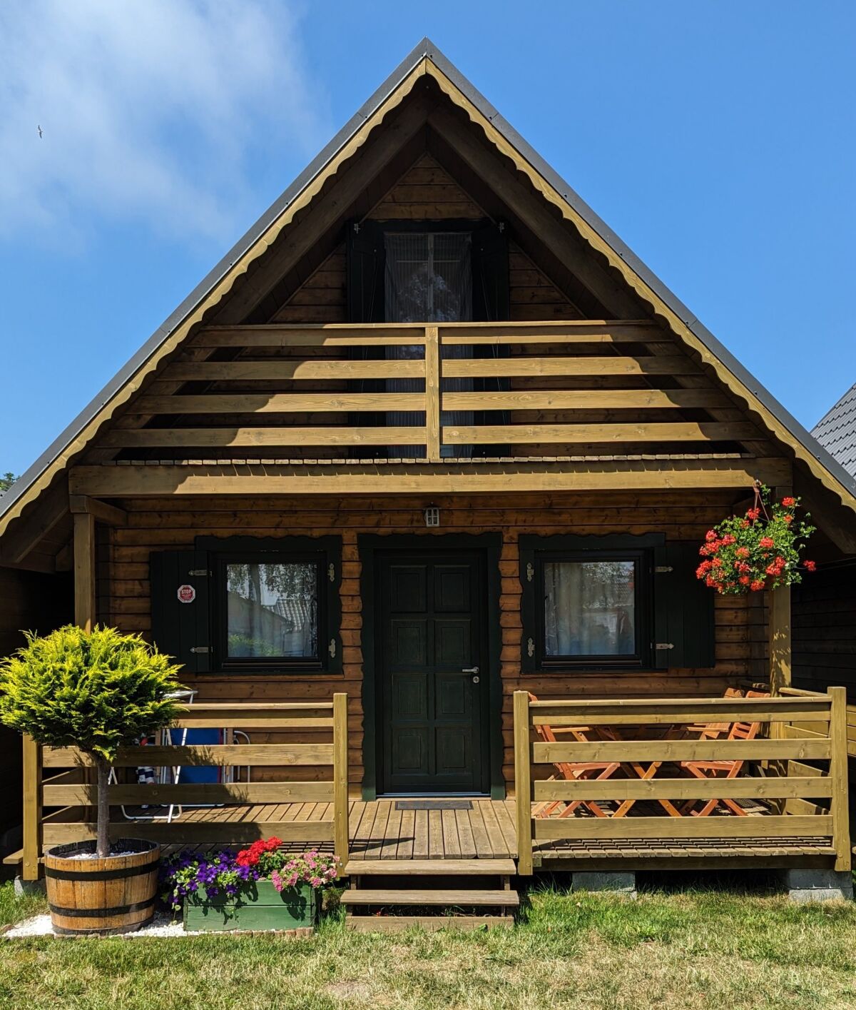Na odwiedzających nas Gości czekają przytulne, komfortowe, piętrowe domki z ogródkiem rekreacyjnym pow. 25 m² (z murowanym grillem), zapewniające pełną intymność dla wypoczywających.