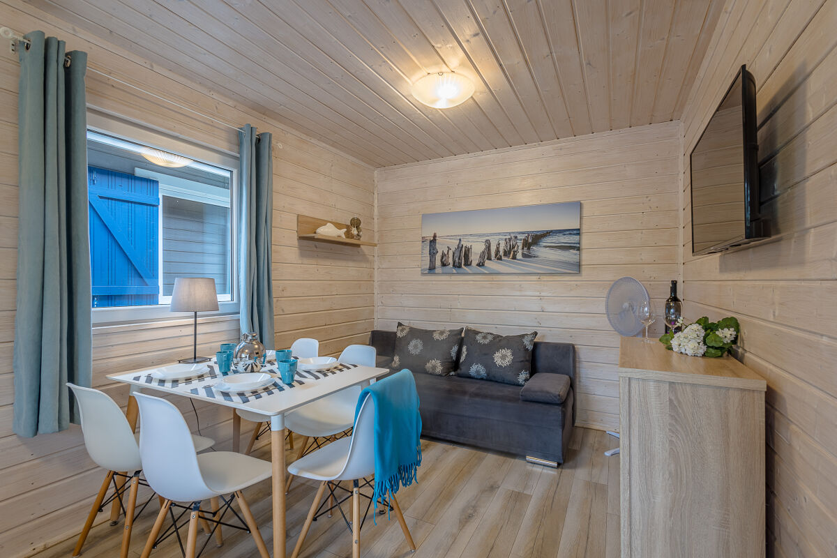 • salon z jadalnią: rozkładana sofa dla 2 osób, pościel, telewizor LED 40”, stół, półki, lampki nocne,