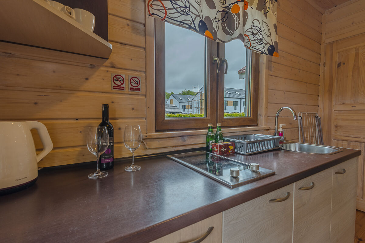 • aneks kuchenny: lodówka w zabudowie, ceramiczna płyta grzewcza, czajnik elektryczny, komplet naczyń i sztućców,