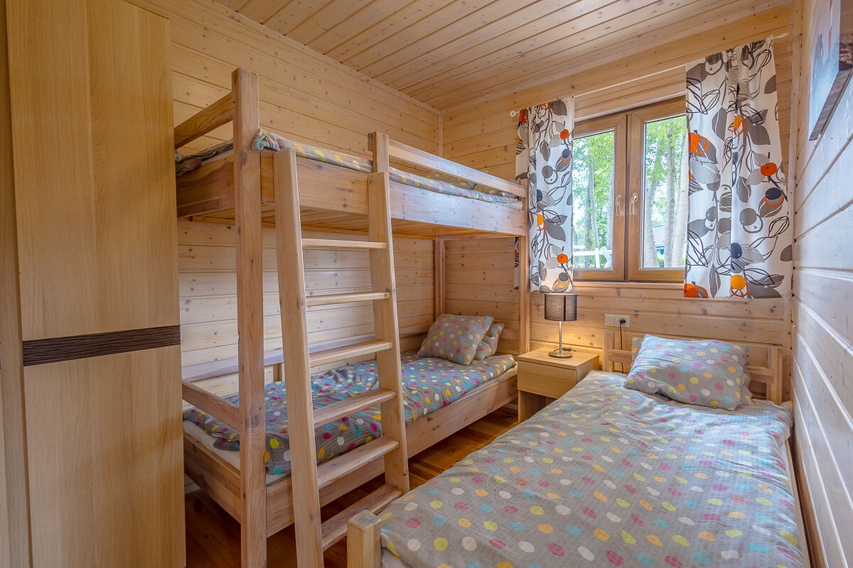 • sypialnie (domek 3-pokojowy): łóżko małżeńskie, łóżko piętrowe (3 miejsca), szafa, komoda,