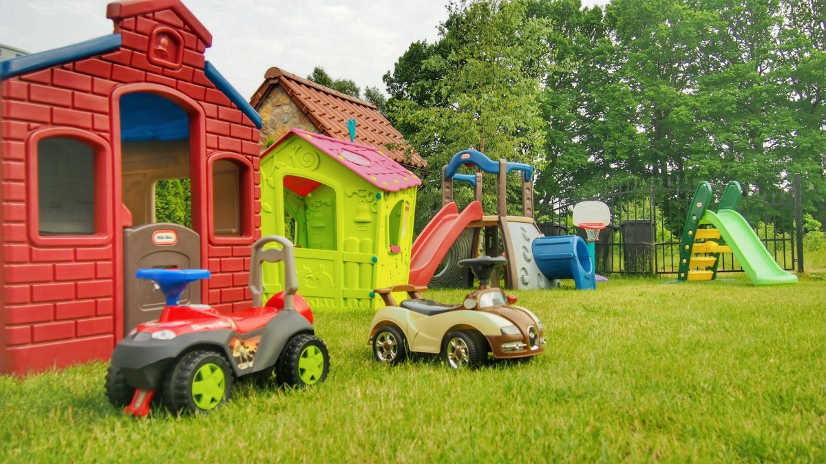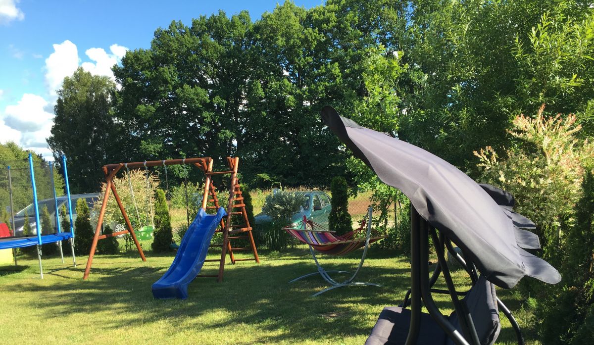 Całość jest ogrodzona . Na posesji znajduje się plac zabaw z wyposażeniem (np. trampolina).