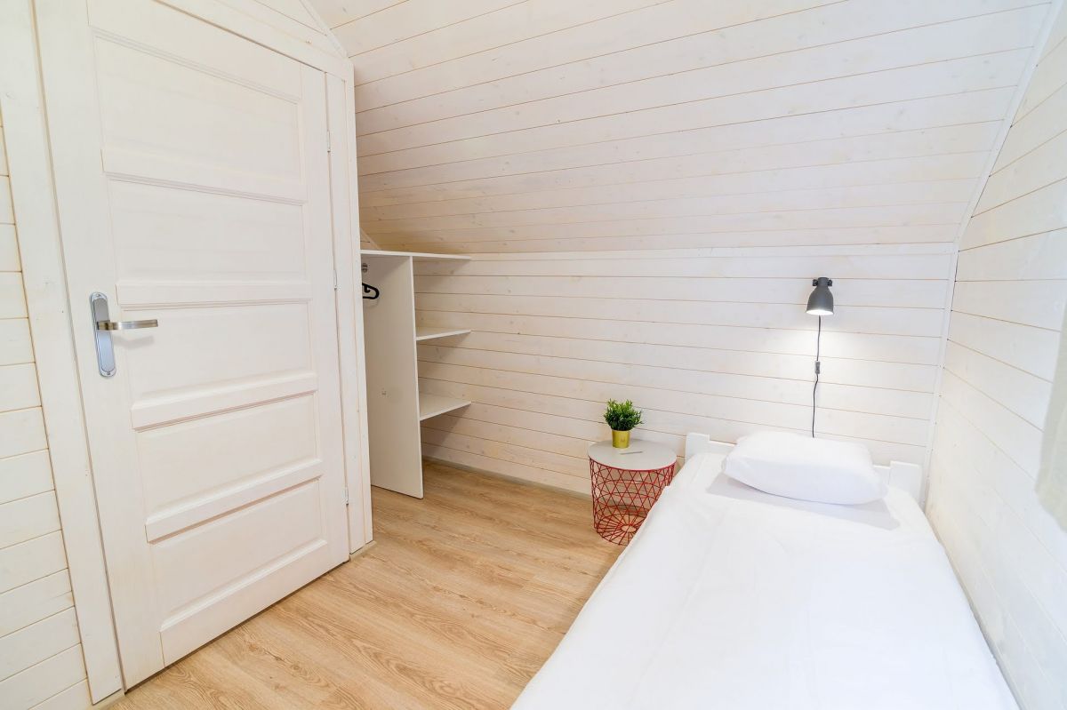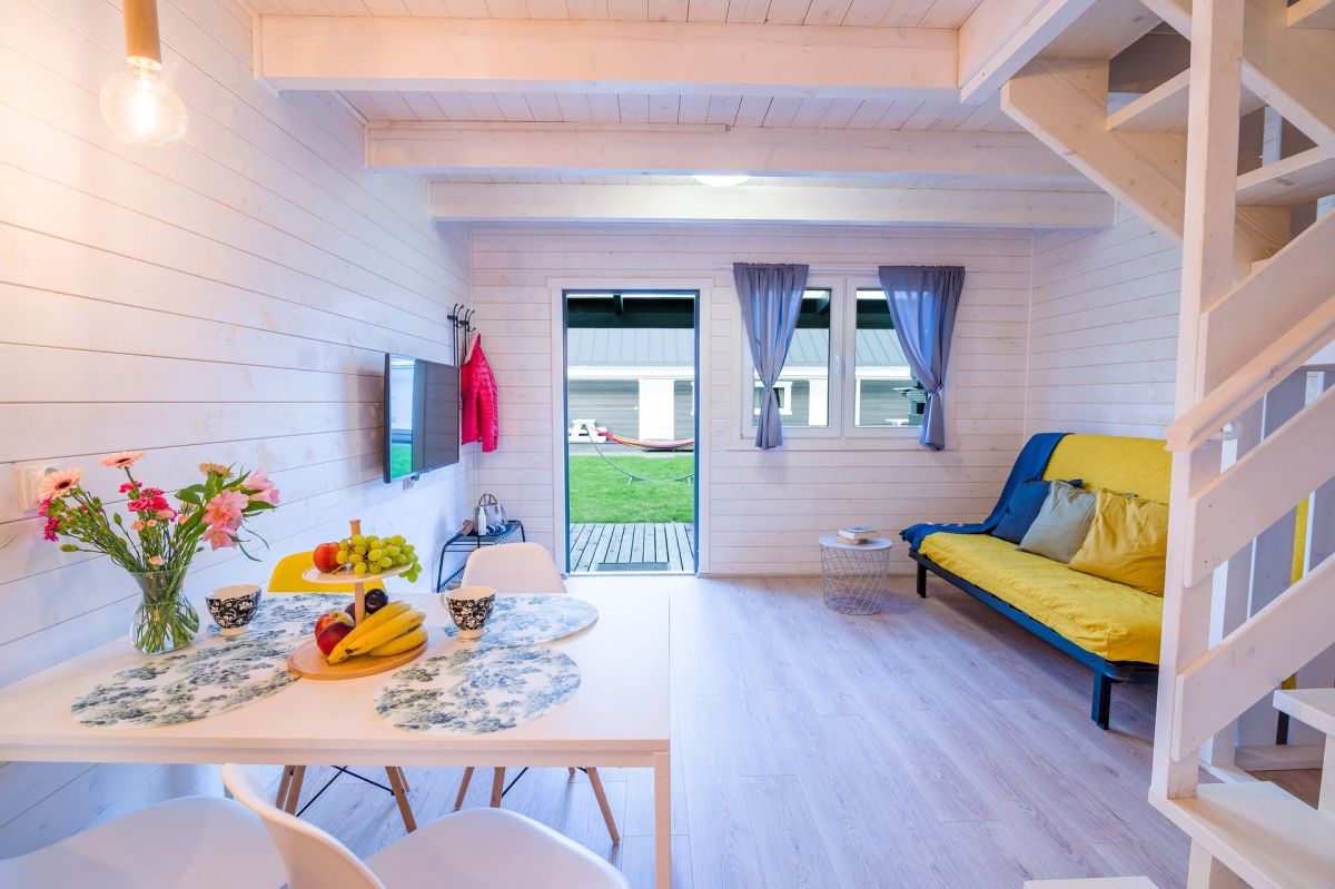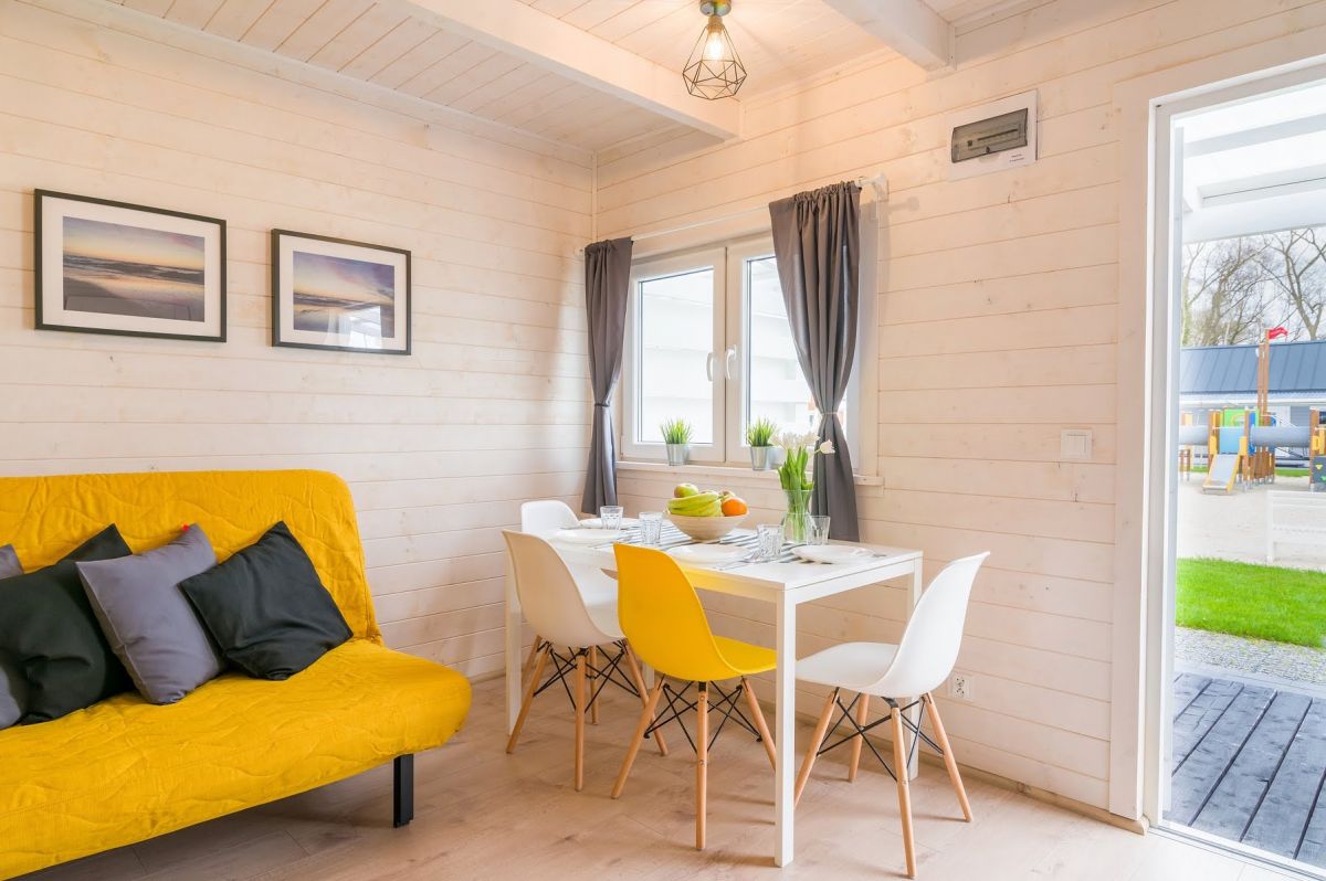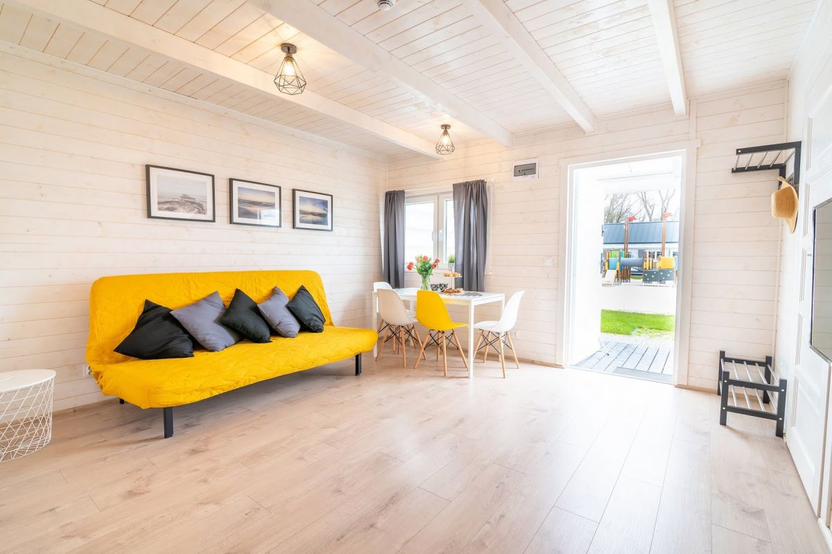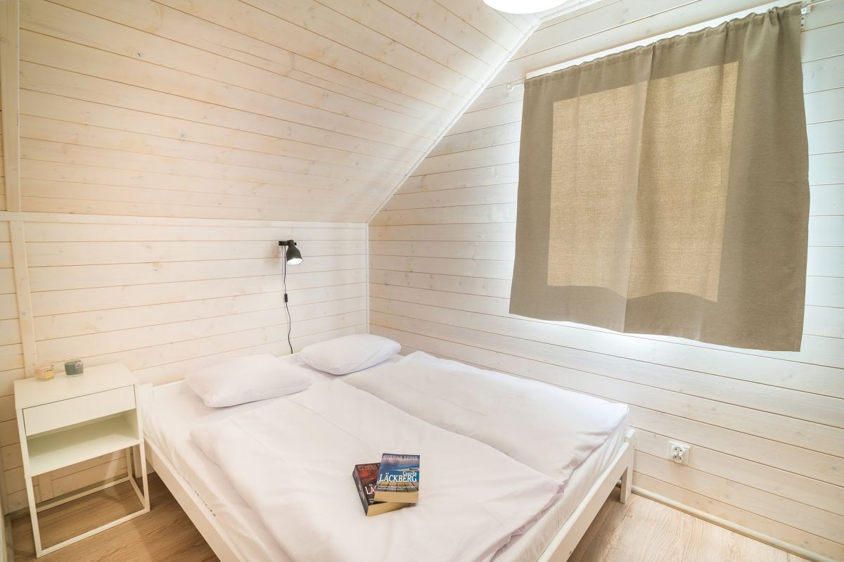 Nasze domki drewniane są nowe, komfortowe i doskonale wyposażone. Każdy z domków posiada salon oraz 2 sypialnie. Jedną z łożem małżeńskim , drugą z dwoma łóżkami pojedynczymi. Kuchnia wyposażona jest w lodówkę, kuchenkę oraz zmywarkę.