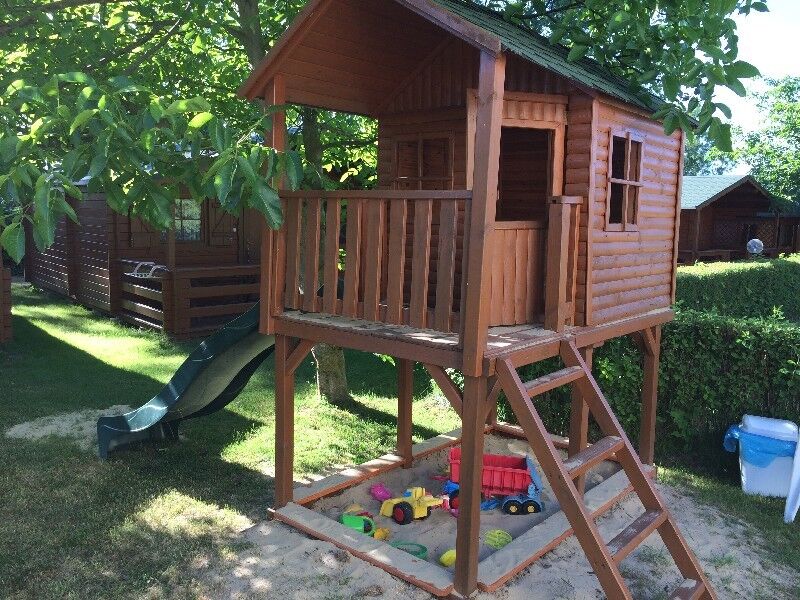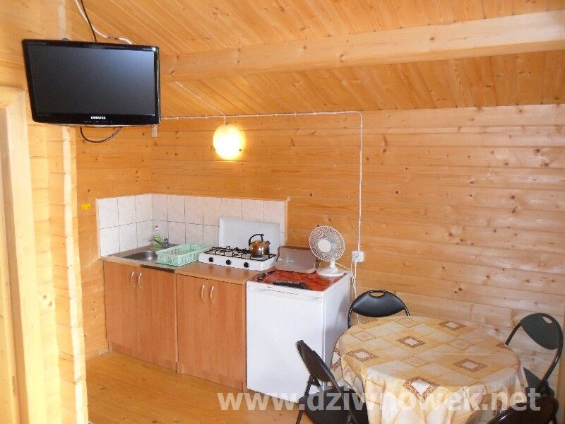 Wykonane są z pełnego drewna świerkowego, dwupokojowe ( sypialnia i pokój dzienny z aneksem kuchennym ) z łazienką. W łazience znajduje się kabina prysznicowa, umywalka, oraz wc. Aneks kuchenny jest w pełni wyposażony: lodówka, zlewozmywak, oraz kuchenka ceramiczna do przygotowywania posiłków. Dostępne jest tu także całe potrzebne wyposażenie w postaci garnków, kubków, sztućców itd.