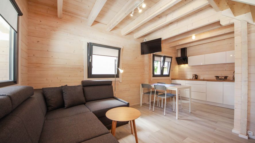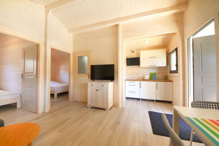 - Przestronne domki parterowe i piętrowe (2-8 os.) – z aneksem kuchennym, werandą i nowoczesną łazienką.