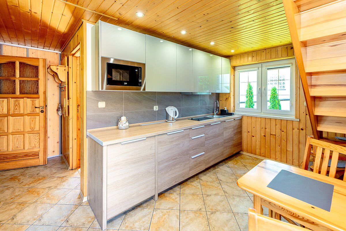 • Parter: salon z aneksem kuchennym, 2 sypialnie (1 łóżko małżeńskie, 1 pojedyncze), łazienka