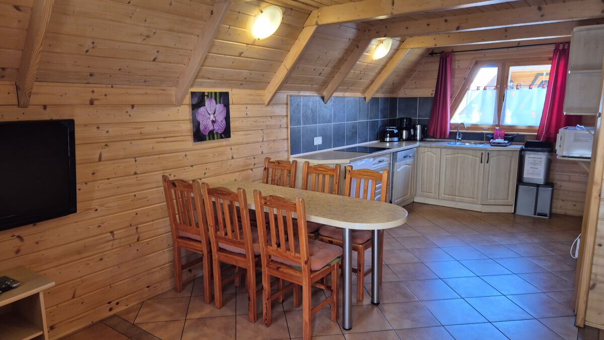 Na parterze domku znajduje się salon z częścią jadalną i wypoczynkową. Telewizja satelitarna może umilić czas pobytu. Kanapa rogowa spełnia również funkcję sypialną dla dwóch dodatkowych osób. Otwarta i w pełni wyposażona kuchnia graniczy z aneksem jadalnym i salonem. Do wyposażenia kuchni należą: lodówka z zamrażalnikiem, kuchenka mikrofalowa, płyta ceramiczna z czterema polami grzewczymi, zmywarka, ekspres do kawy, toster, czajnik elektryczny, garnki, naczynia, sztućce, akcesoria gospodarstwa domowego. Obszerna łazienka ze światłem dziennym, wyposażona w natrysk, ubikację oraz umywalkę znajduje się w sąsiedztwie salonu i kuchni. Domek posiada dwie oddzielne, zamykane sypialnie na piętrze. Jedna z nich wyposażona jest w cztery łóżka jednoosobowe oraz dwie komody, a druga w dwa łóżka jednoosobowe i nocny stolik. Zabudowana szafa w przedpokoju dzieli obydwie sypialnie. Niewątpliwym urokiem domków są przytulne, zwrócone na południe, wyposażone w meble ogrodowe drewniane tarasy, umożliwiające korzystanie z pięknej pogody i promieni słonecznych podczas całego pobytu.