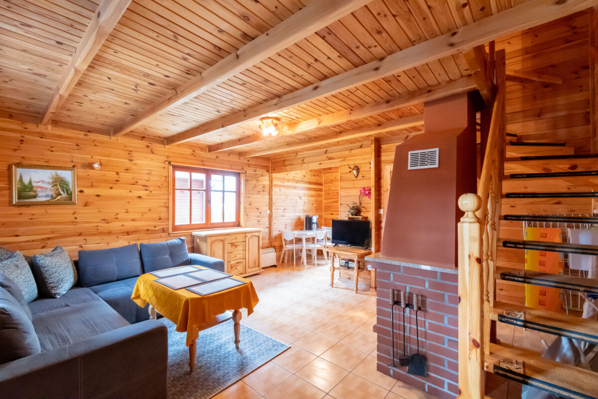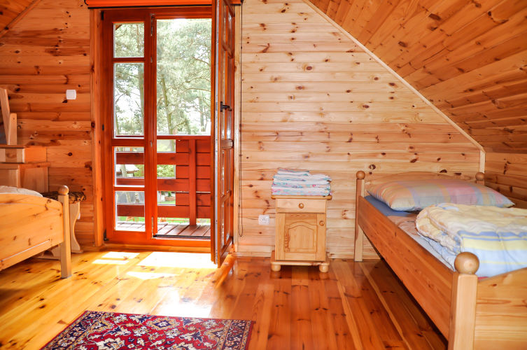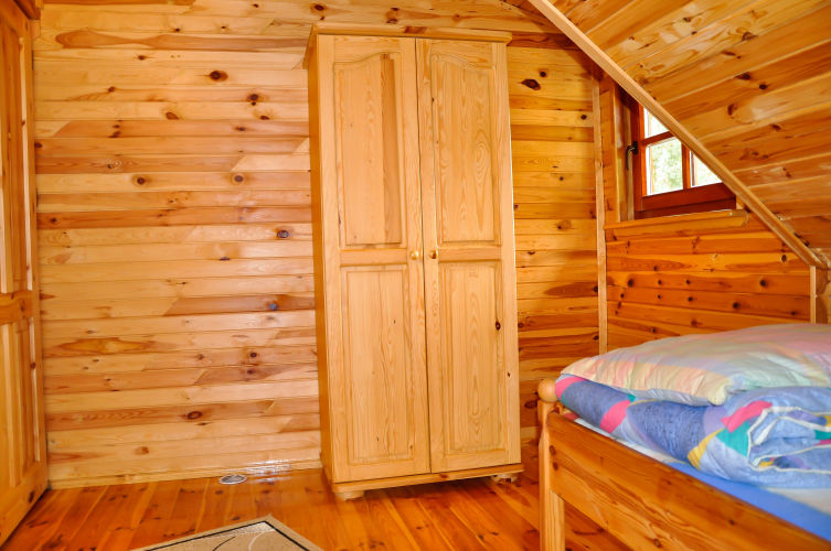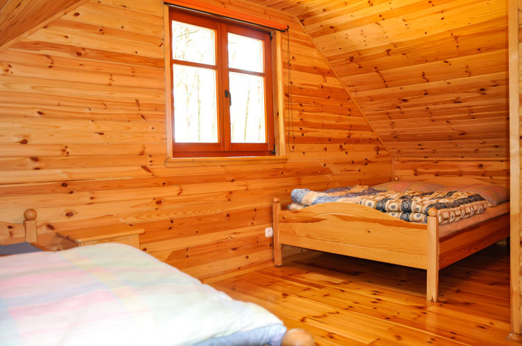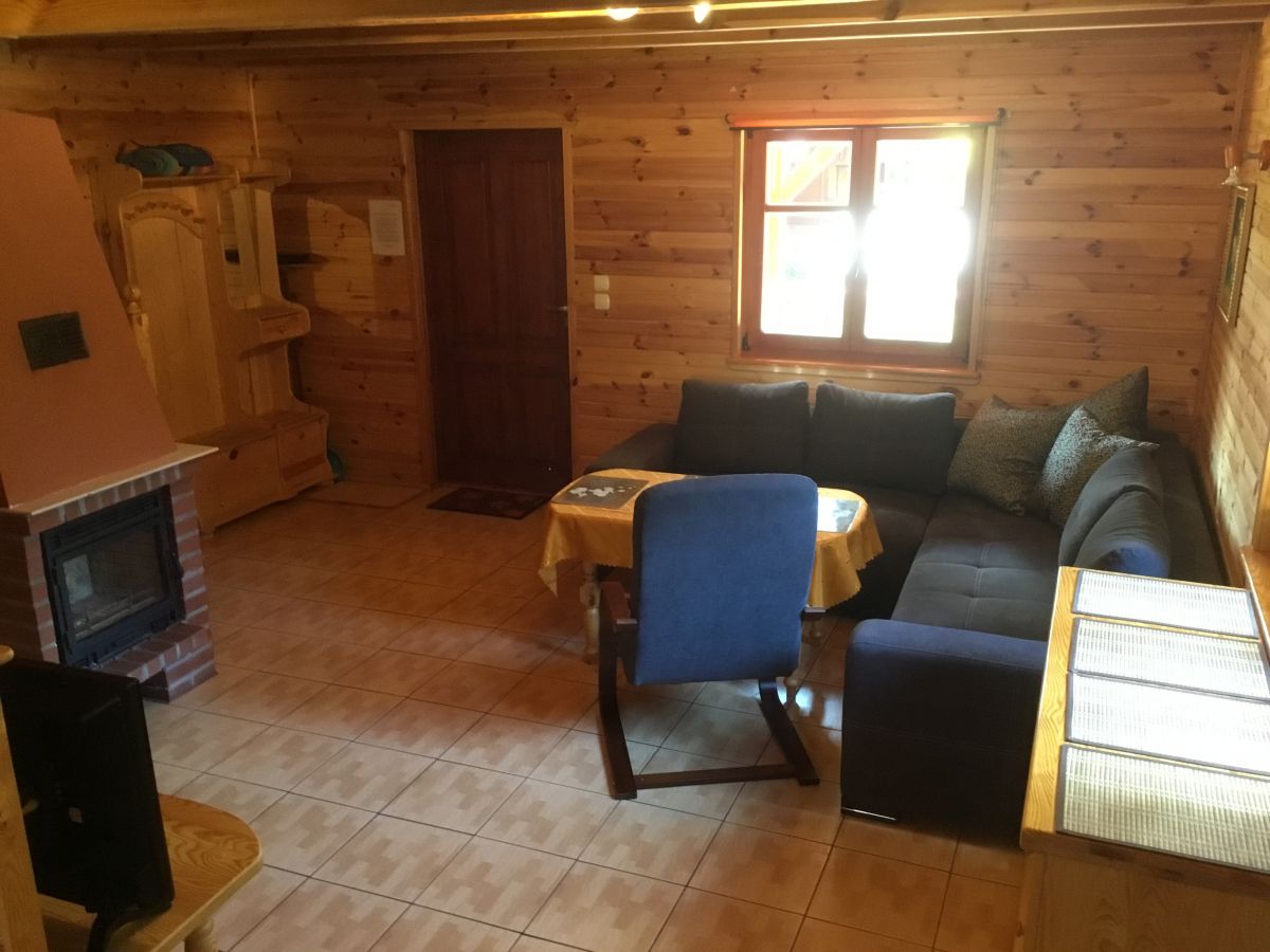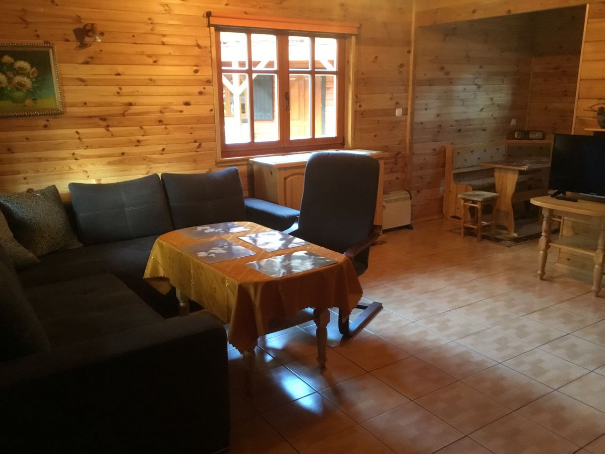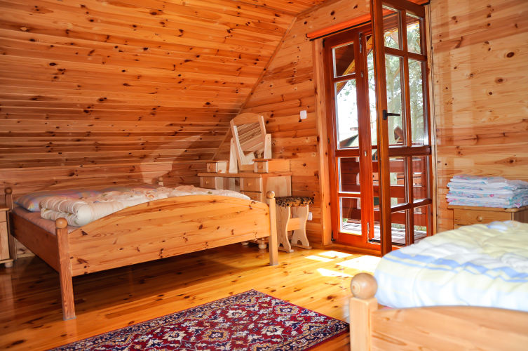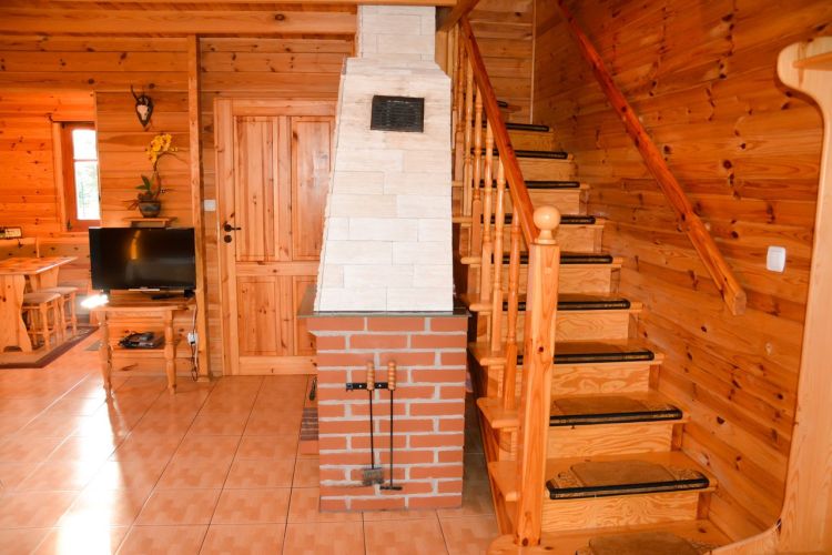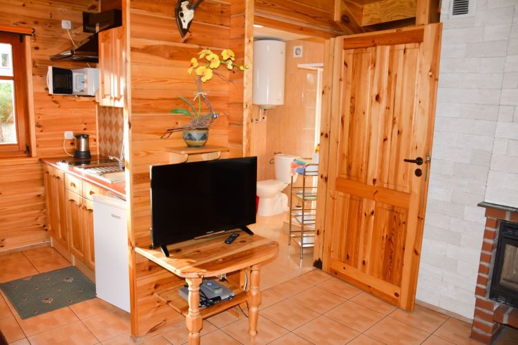 W parterowej części domku znajduje się salon z kominkiem i telewizorem, duża, przestrzenna toaleta, aneks kuchenny wyposażony w kuchenkę elektryczną, lodówkę, mikrofalę , zlewozmywak oraz naczynia do gotowania, itd. . Na piętrze znajdują się dwie oddzielne sypialnie . W domach 4 osobowych są dwie sypialnie 2 osobowe ( łóżko małżeńskie i dwa łóżka pojedyncze ) w domach 6 osobowych znajdują się dwie sypialnie 3 osobowe w każde∆ sypialni jest łóżko małżeńskie i łóżko pojedyncze .