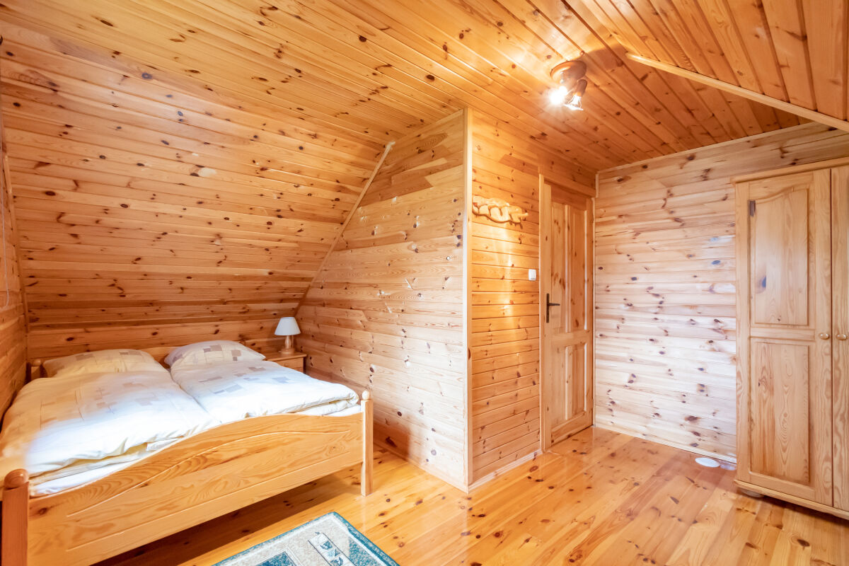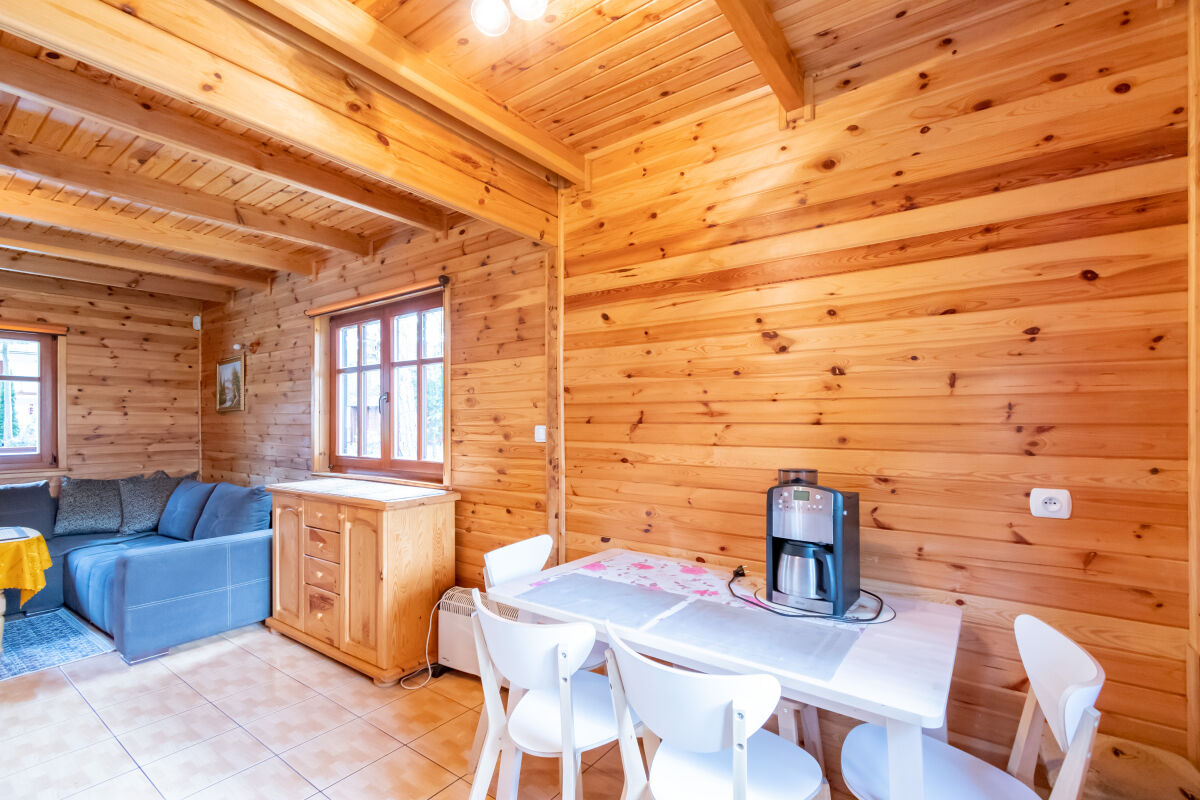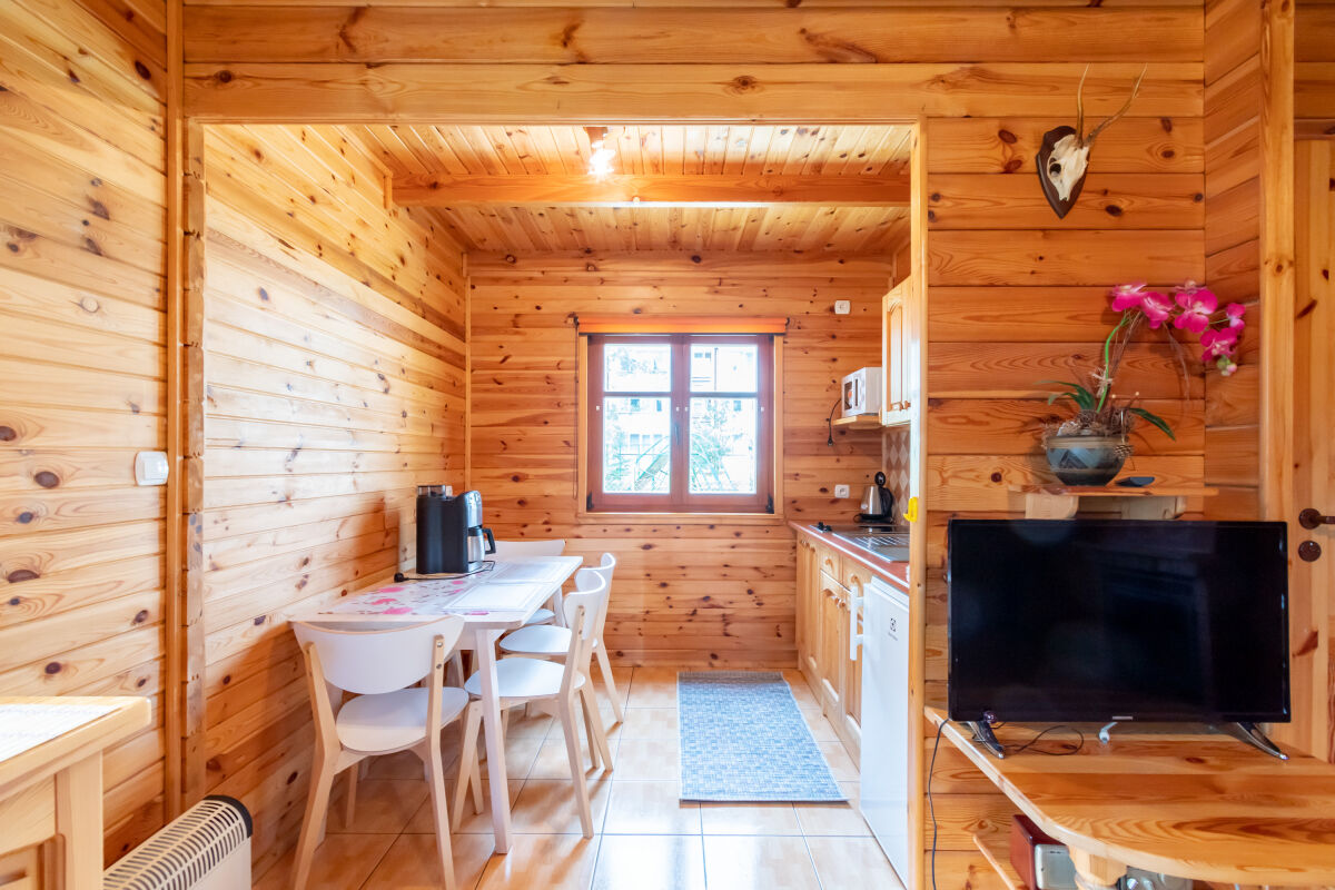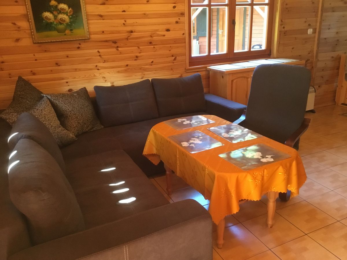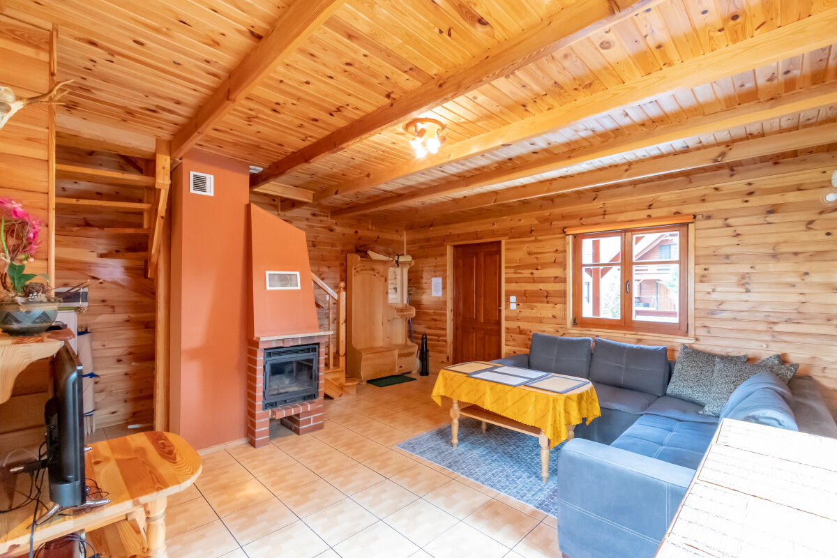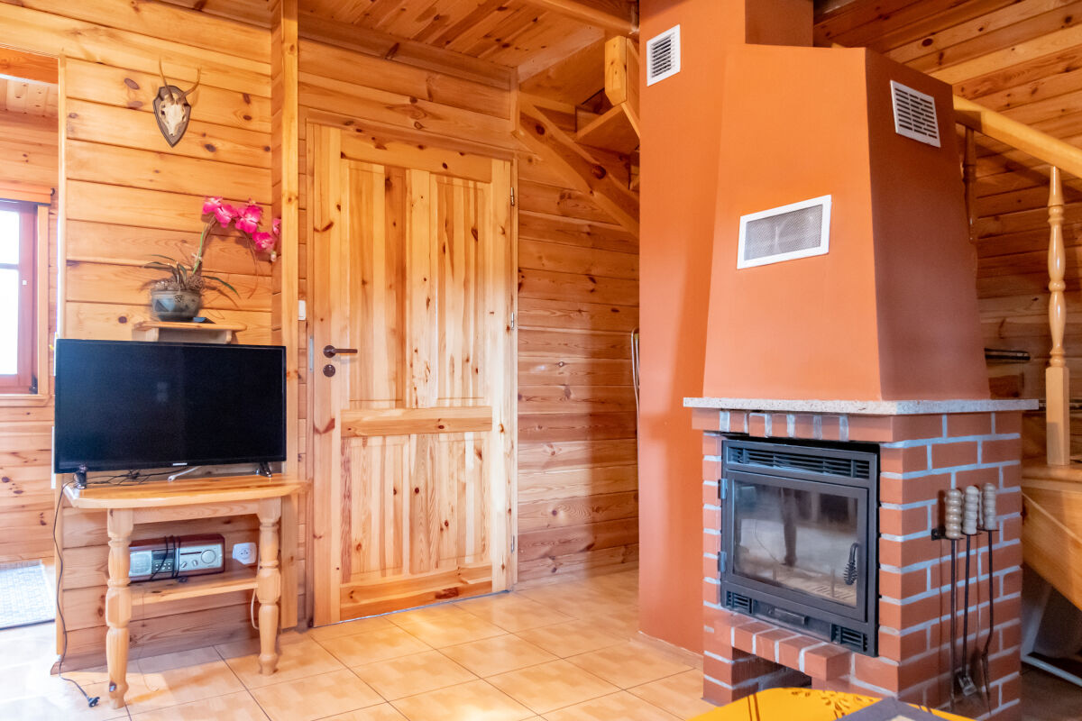 W parterowej części domku znajduje się salon z kominkiem i telewizorem, duża, przestrzenna toaleta, aneks kuchenny wyposażony w kuchenkę elektryczną, lodówkę, mikrofalę , zlewozmywak oraz naczynia do gotowania, itd. . Na piętrze znajdują się dwie oddzielne sypialnie . W domach 4 osobowych są dwie sypialnie 2 osobowe ( łóżko małżeńskie i dwa łóżka pojedyncze ) w domach 6 osobowych znajdują się dwie sypialnie 3 osobowe w każde∆ sypialni jest łóżko małżeńskie i łóżko pojedyncze .