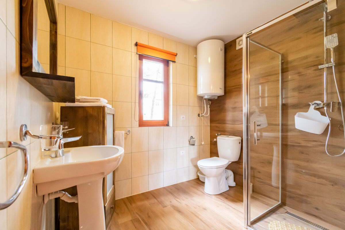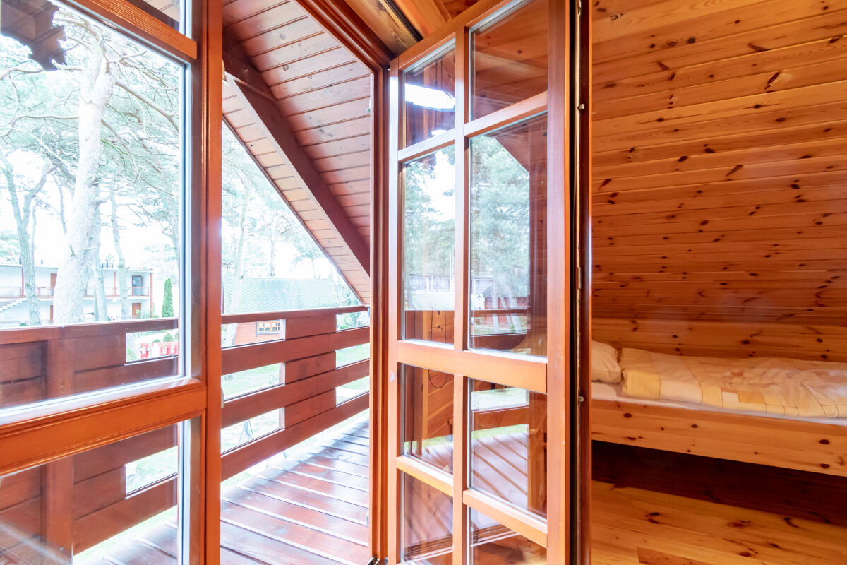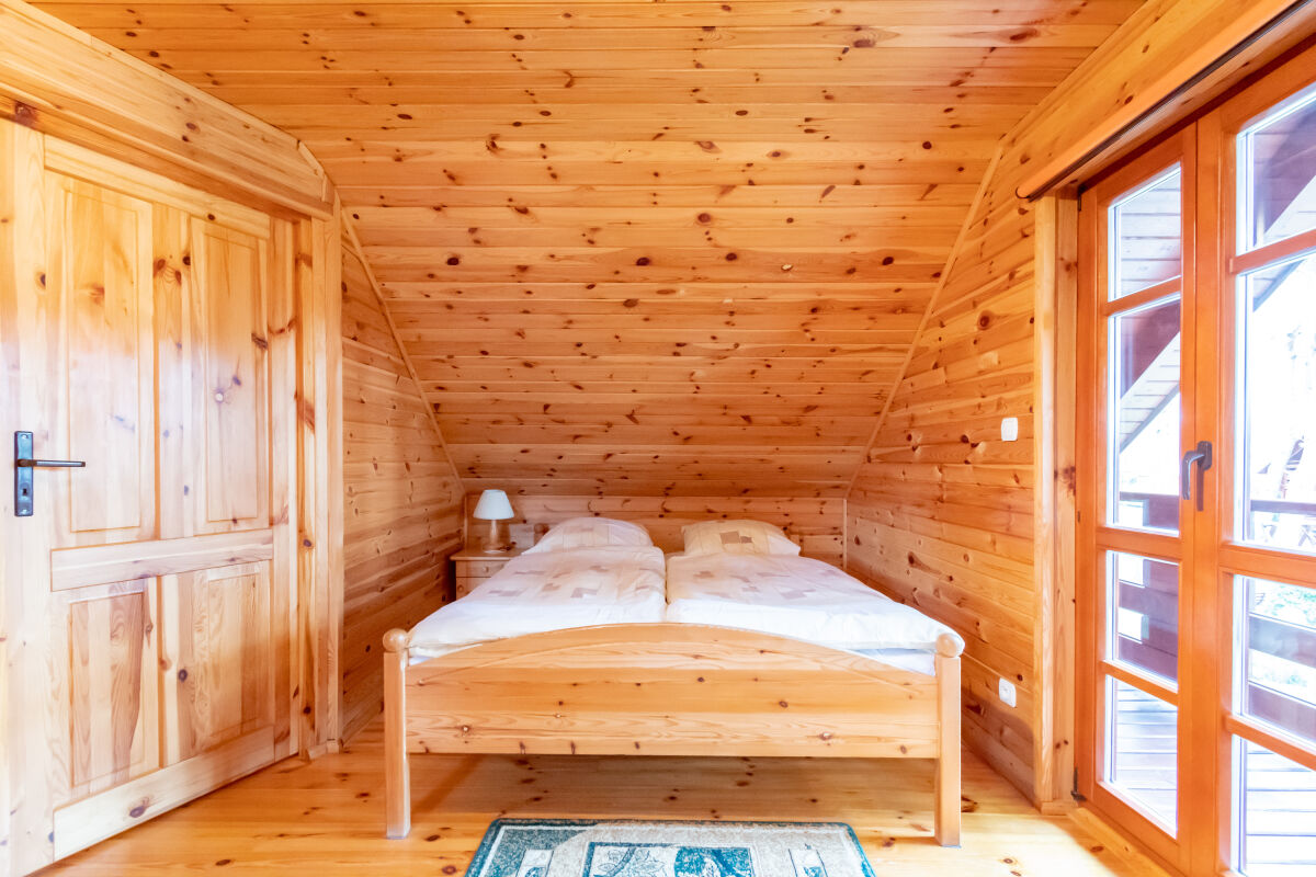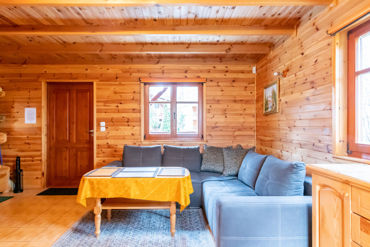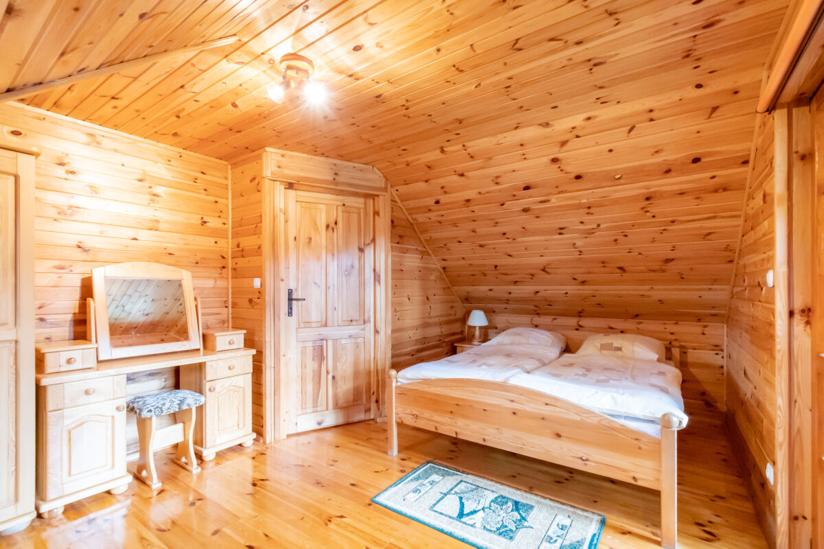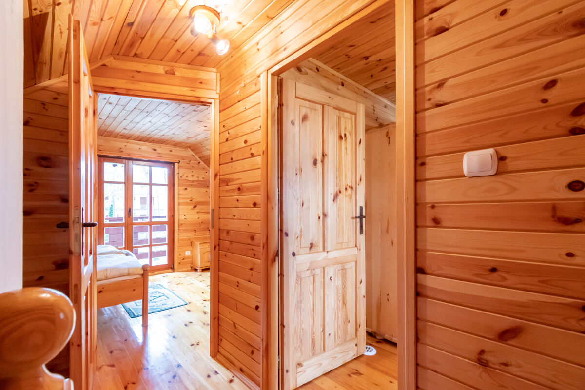 W parterowej części domku znajduje się salon z kominkiem i telewizorem, duża, przestrzenna toaleta, aneks kuchenny wyposażony w kuchenkę elektryczną, lodówkę, mikrofalę , zlewozmywak oraz naczynia do gotowania, itd. . Na piętrze znajdują się dwie oddzielne sypialnie . W domach 4 osobowych są dwie sypialnie 2 osobowe ( łóżko małżeńskie i dwa łóżka pojedyncze ) w domach 6 osobowych znajdują się dwie sypialnie 3 osobowe w każde∆ sypialni jest łóżko małżeńskie i łóżko pojedyncze .