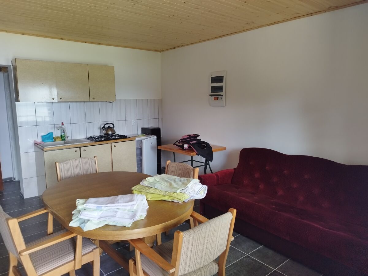 Na domek składa się: na parterze - salon z aneksem kuchennym, 2 sypialnie, łazienka, taras. Na piętrze 1 sypialnia. Aneks kuchenny z pełnym wyposażeniem.