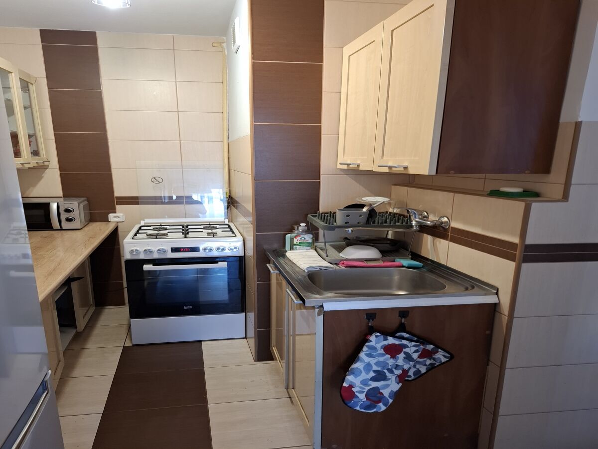 * funkcjonalnej kuchni wyposażonej w kuchenkę gazową z piekarnikiem, lodówkę, kuchenkę mikrofalową, czajnik elektryczny, mikser ,toster do zapiekanek oraz naczynia, sztućce, garnki i patelnie, cały sprzęt kuchenny jest nowy.