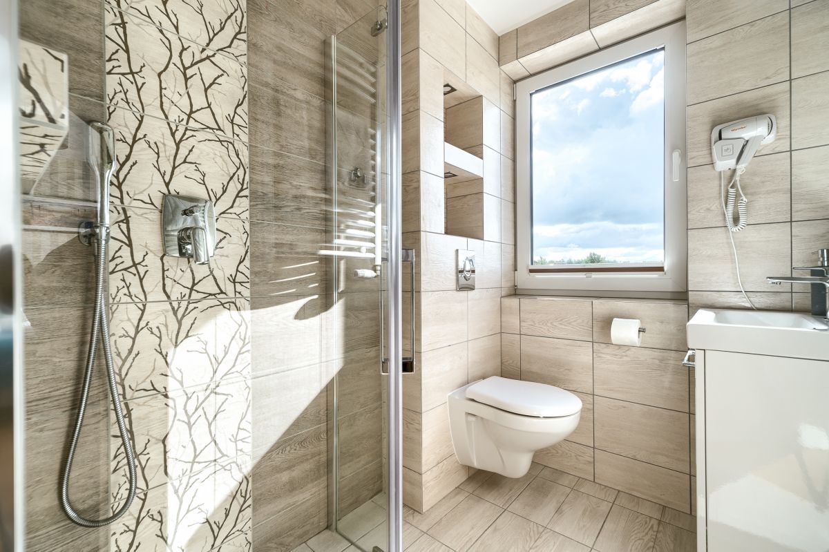 - wszystkie pokoje posiadają własne łazienki w pokojach (prysznic, umywalka, WC)