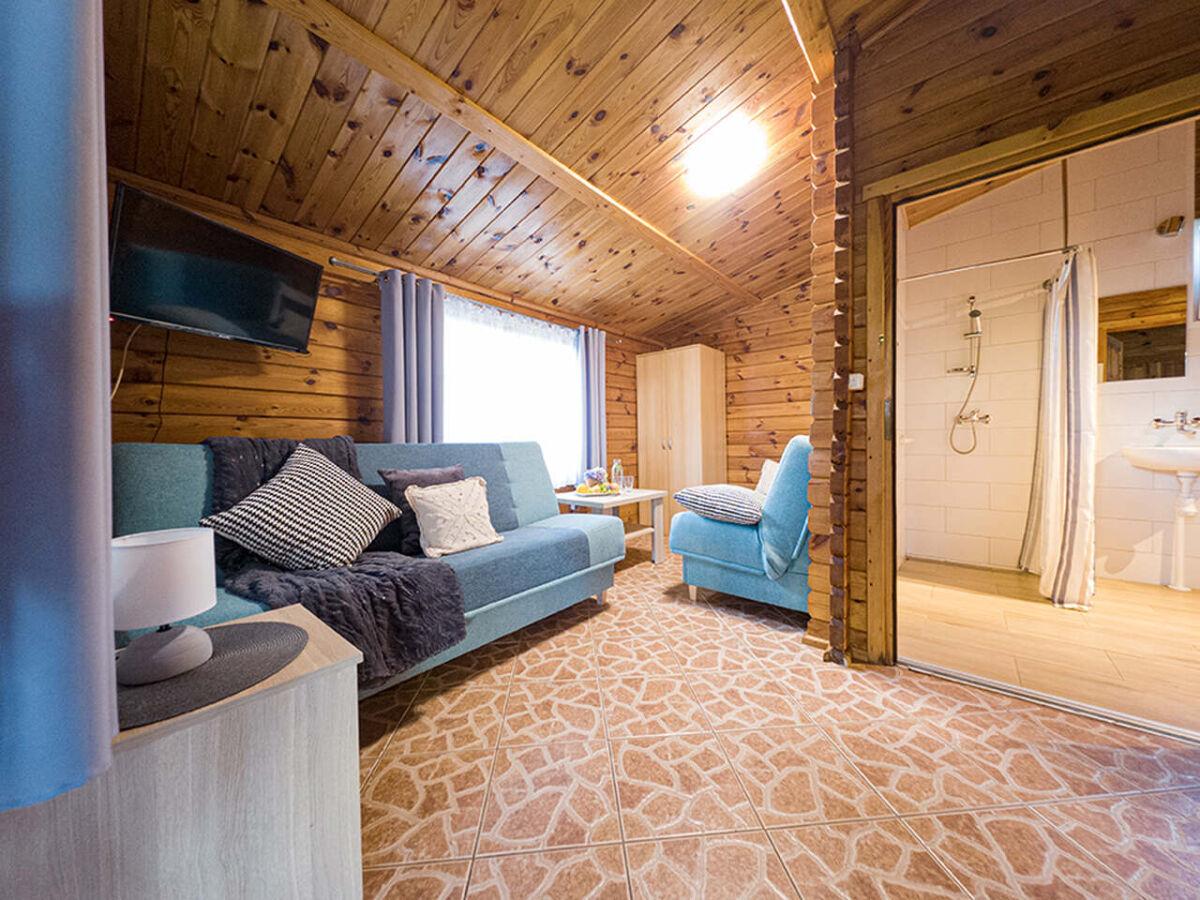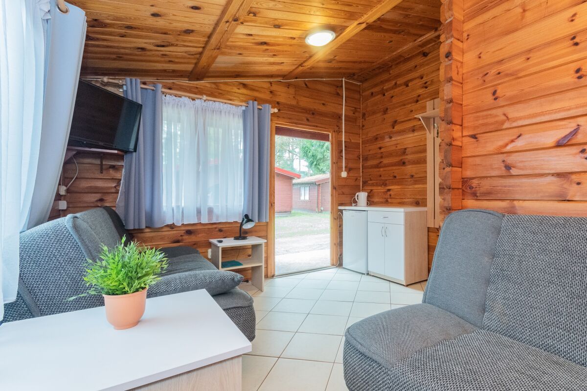 • Jednorodzinne przytulne domki drewniane typu „Mikołajki” z jednym wejściem : dwupokojowe z tarasem, aneksem kuchennym z wyposażeniem (czajnik, lodówka, naczynia, sztućce), łazienką, telewizorem LCD, sprzętem plażowym oraz ogrodowym kompletem wypoczynkowym.