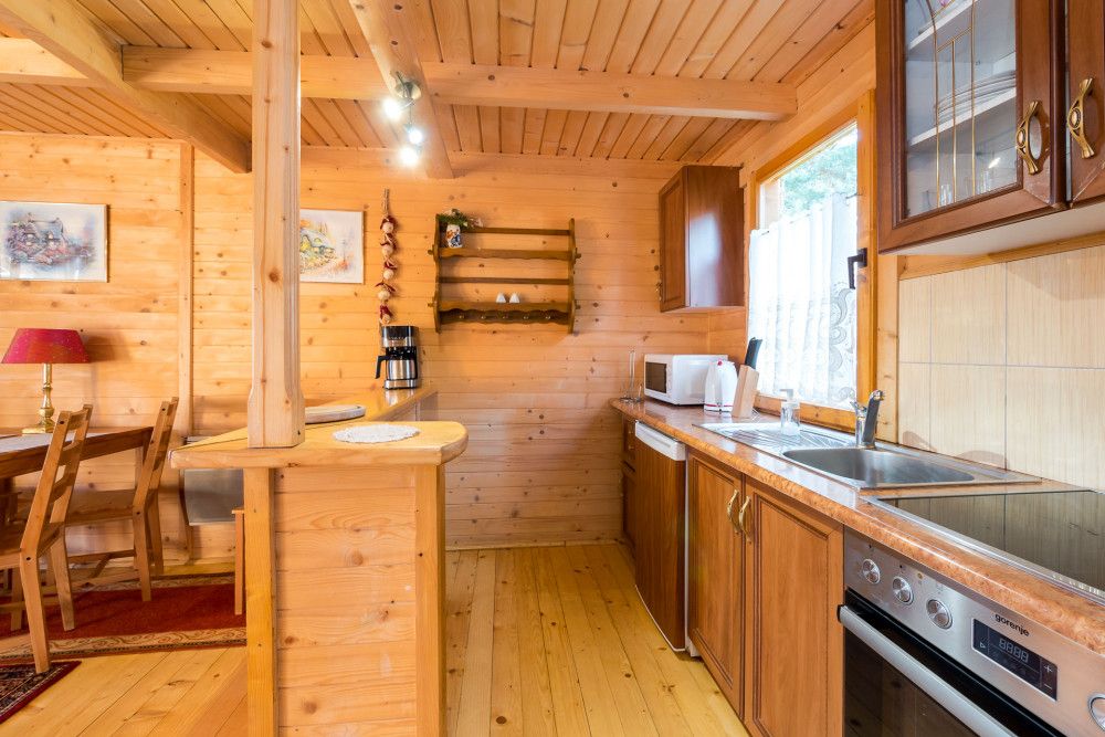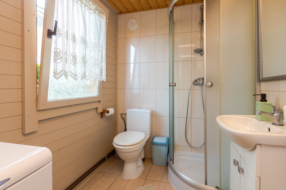 Na parterze domku znajduje się wygodny, przestrzenny salon, kuchnia w pełni wyposażona oraz łazienka (kabina prysznicowa i WC).