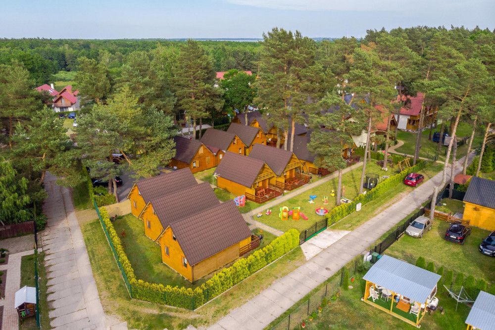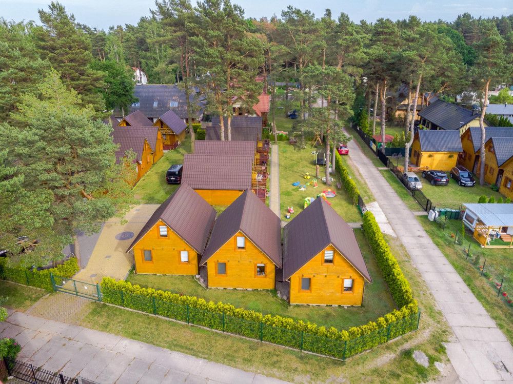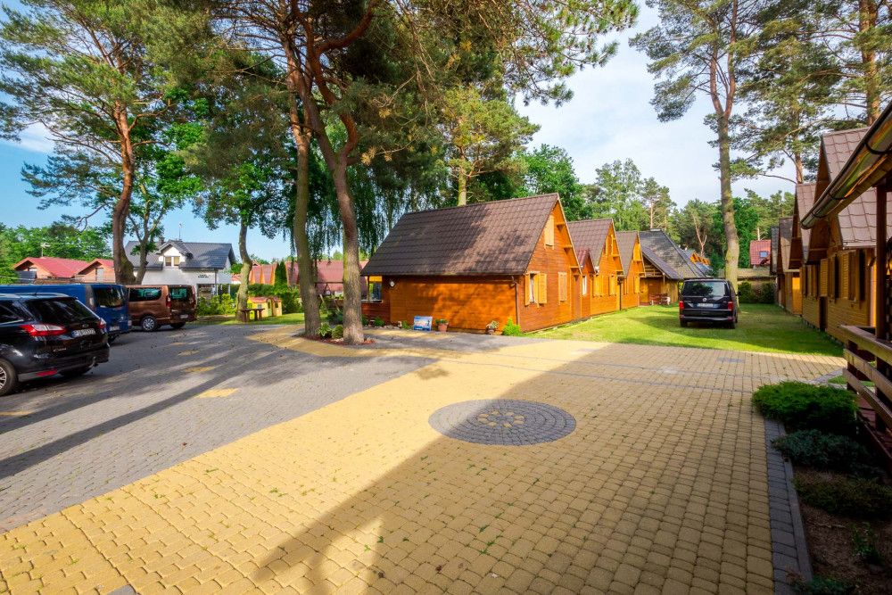 Dogodna lokalizacja. Domki (o pow. 82 m2) usytuowane są na terenie leśnym wśród sosen i zaledwie 10 minut spacerkiem do plaży. W odległości 50 m znajduje się nowo wybudowany kompleks wodno-basenowy. Otoczenie sprzyja relaksowi z dala od miejskiego zgiełku.