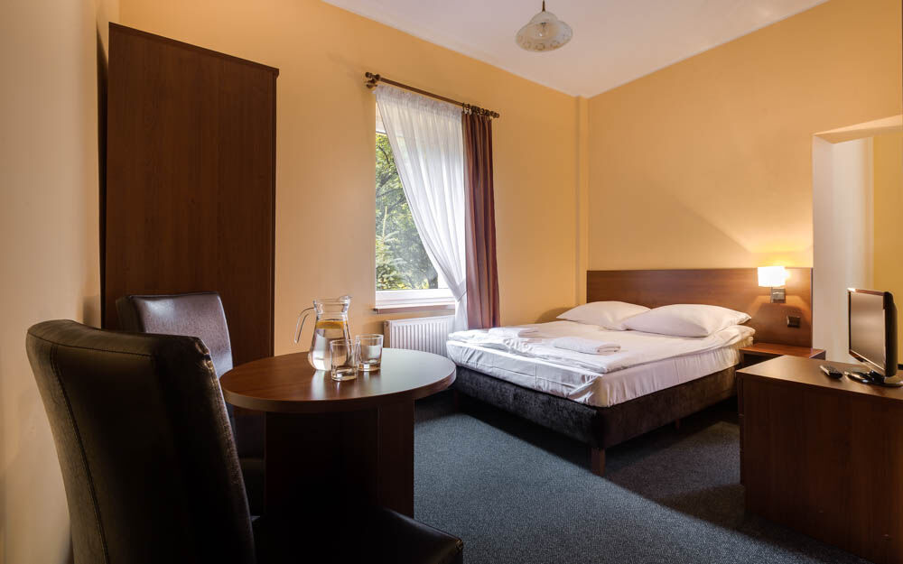 Pokój bardzo ładny, czysty i wygodny, składający się z dwóch części: sypialnej i wypoczynkowej. Do dyspozycji mamy tutaj nie tylko czajnik i kubeczki, ale czeka nas także kawa, herbata oraz cukier. W części wypoczynkowej znajduje się kanapa, stolik kawowy, telewizor oraz szafa na ubrania. W części sypialnej oprócz bardzo wygodnego łóżka, są szafki nocne, stolik oraz dwa fotele. Przepiękny widok z okna! Cisza i spokój. Jeśli ktoś ma młodsze dzieci, to te z pewnością nie będą się nudzić na placu zabaw. Warto zajrzeć także do informatora w pokoju. Są tam fajne propozycje wycieczek a także opis skrótu dzięki któremu szybko znajdziemy się w centrum, podziwiając po drodze wspaniałe okoliczności przyrody. Łatwy dojazd. Miła obsługa. Wszystko, czego można chcieć, by w pełni wypocząć i zregenerować się. My wrócimy tu za rok !!!!