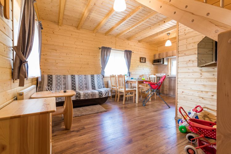 Każdy domek składa się z salonu z aneksem kuchennym, łazienki oraz dwóch zamykanych sypialni na piętrze.