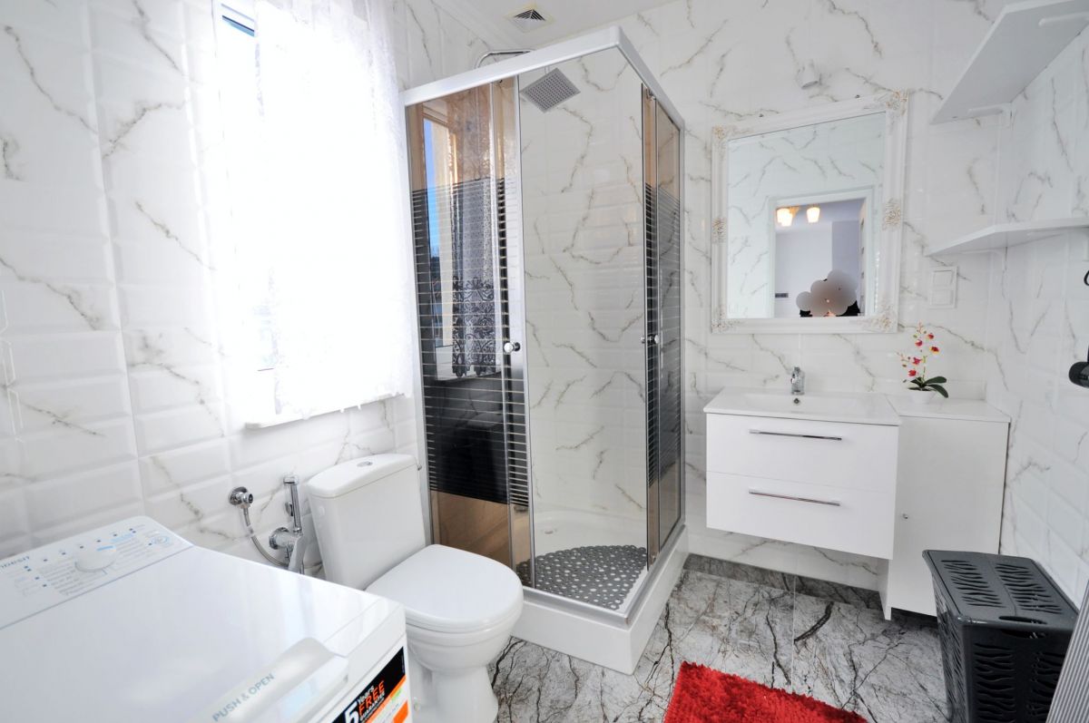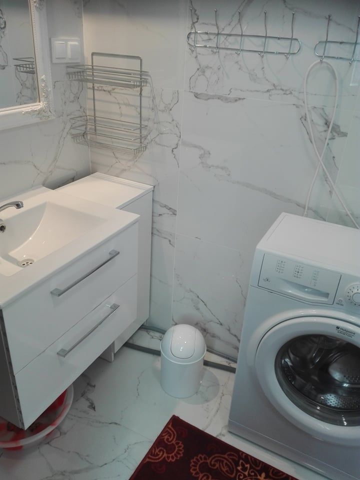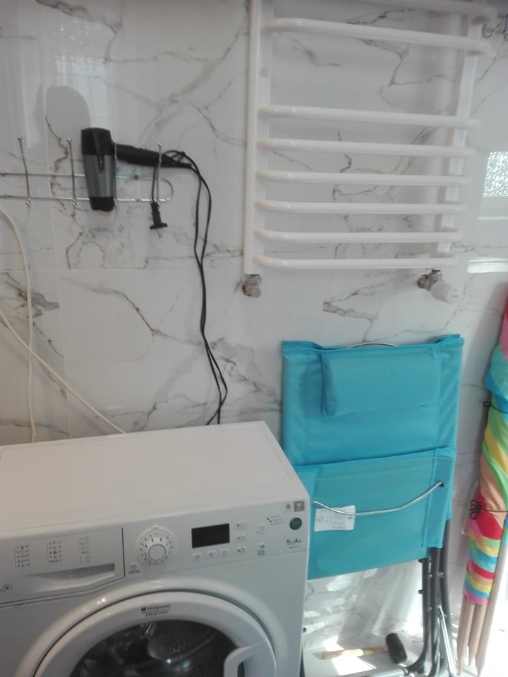 W łazience jest pralka, bidet, duże lustro, suszarka na pranie, suszarka do włosów, deska do prasowania, żelazko, ściereczki i środki czystości.
