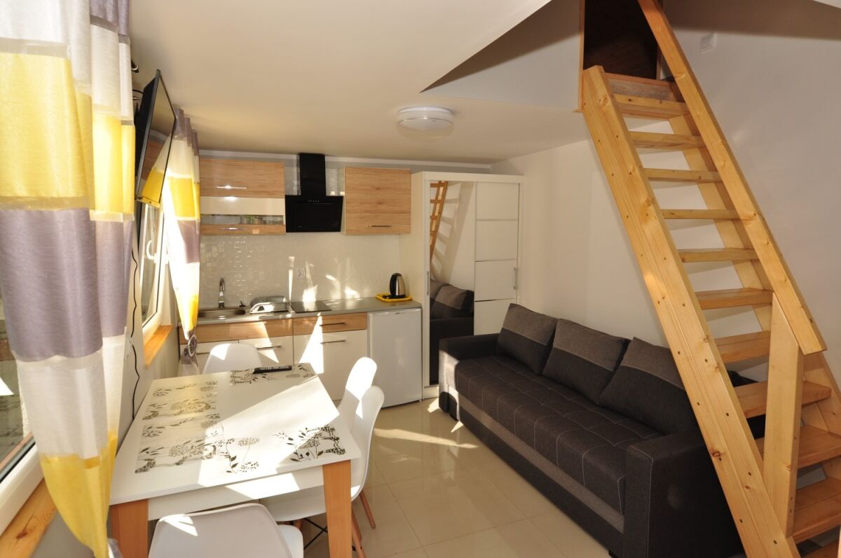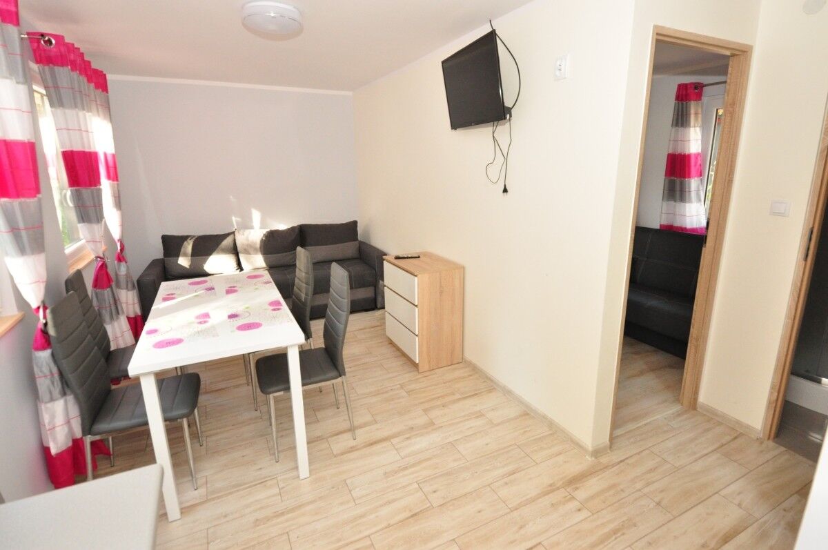 kazdym domek posiada łazienke aneks kuchenny lub kuchnie i TV . Domki dla 2-11 osób,