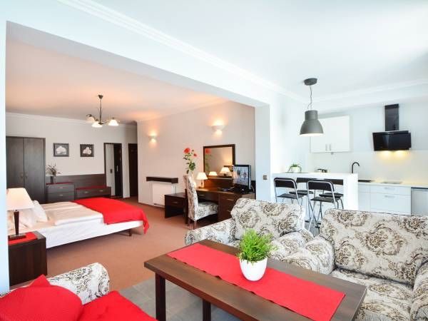 Do dyspozycji Gości dwa luksusowo wyposażone apartamenty z łazienkami i umeblowanymi tarasami tuż nad lustrem wody. Apartament wyposażony w łoże małżeńskie składające się z 2 materacy (90 x 200 cm), komplet wypoczynkowego, rozkładanej sofy 1 osobowej (możliwość dodatkowej dostawki), łazienka z natryskiem, suszarka do włosów. TV-sat LCD, internet Wi-Fi. Osobna kuchnia na wyłączność: ceramiczna płyta grzewcza, lodówka, zestaw sztućcy, talerze, ekspres do kawy przelewowy, garnki. Słoneczny taras tuż nad stawem z meblami ogrodowymi.
