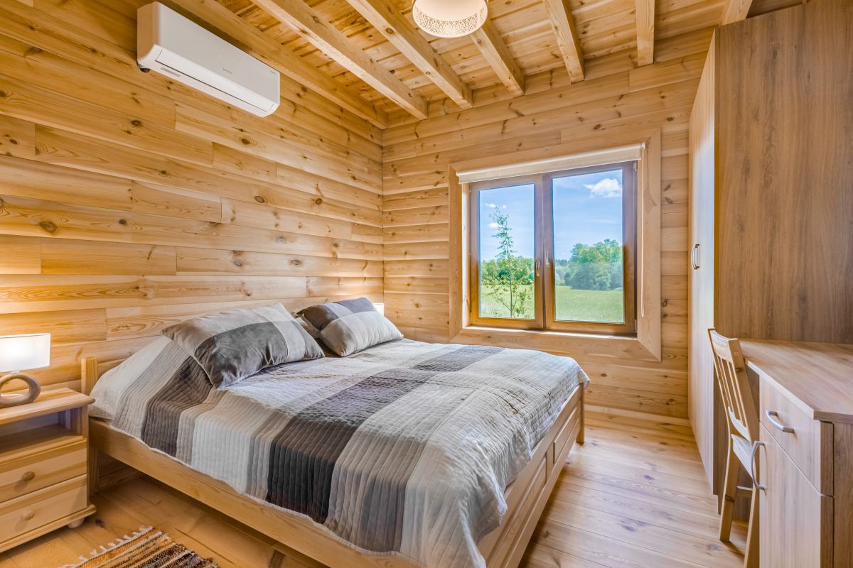 Domek jest wykończony w bardzo wysokim standardzie, z 3 sypialniami, łazienką, toaletą i salonem. Wyposażony jest w aneks kuchenny, kino domowe, klimatyzację, grill itp. Do dyspozycji jest ponad 10 ha terenu z lasem. Jest to miejsce bardzo spokojne, na uboczu, nie docierają tu spacerowicze, brak też innych turystów. Panuje tu absolutny spokój i cisza. Do bezpłatnego WYŁĄCZNEGO użytku katamaran, żaglówka OMEGA duże łodzie wiosłowe, kajaki, oraz rowery.