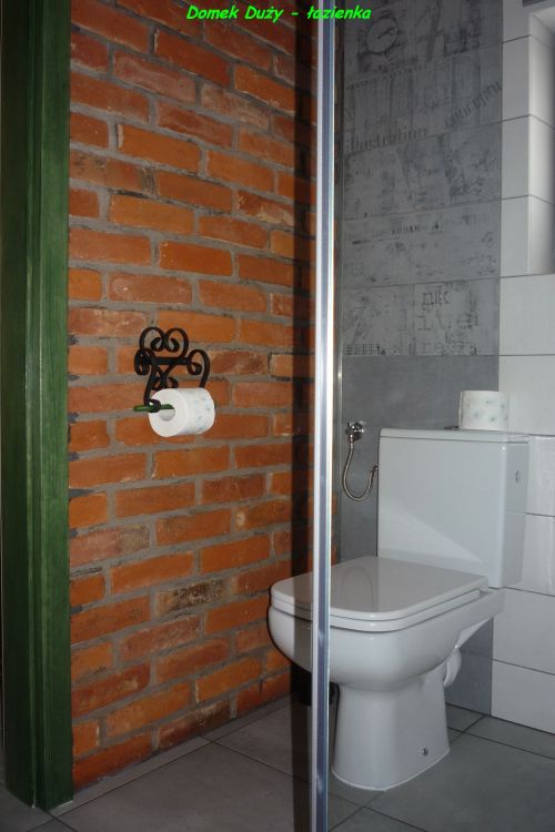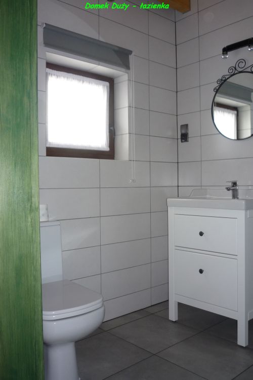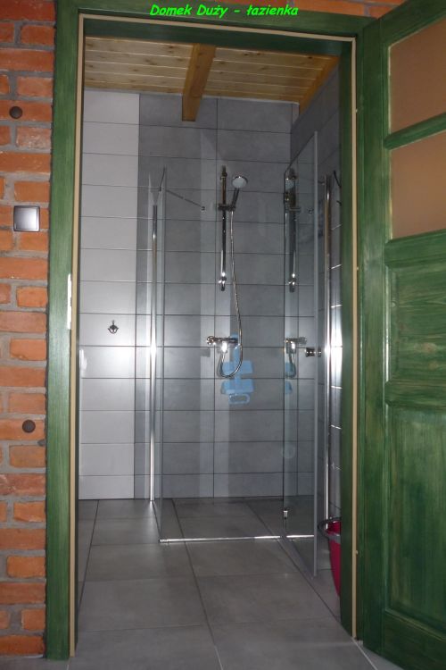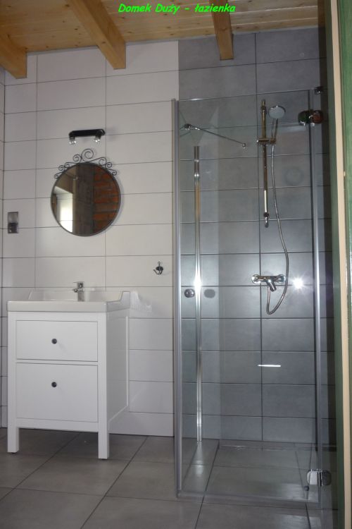 - o duża łazienka z pełnym węzłem sanitarnym (kabina prysznicowa, umywalka z szafką i lustrem, sedes)
