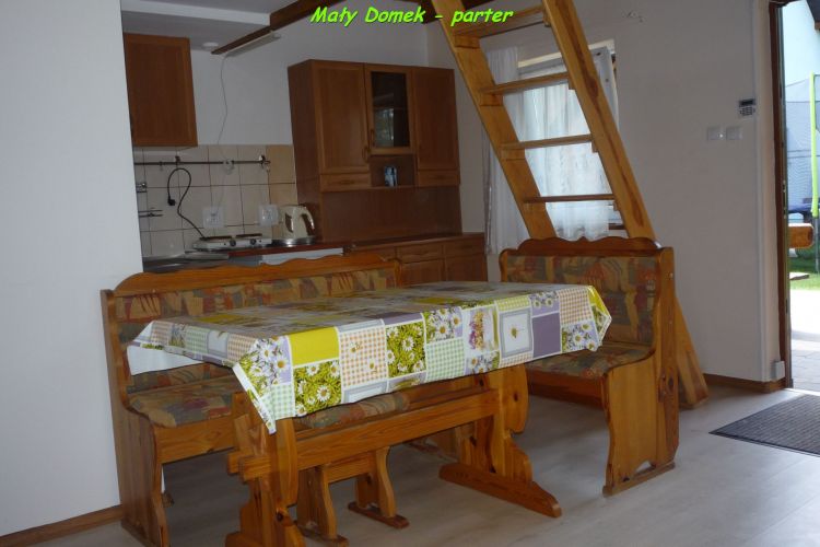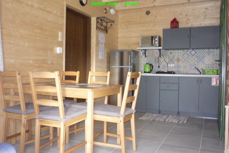 - o aneks kuchenny (lodówka z zamrażalnikiem, kuchenka elektryczna, czajnik elektryczny, stół z ławkami, pełne wyposażenie kuchenno-stołowe (garnki, naczynia, sztućce, itp.))