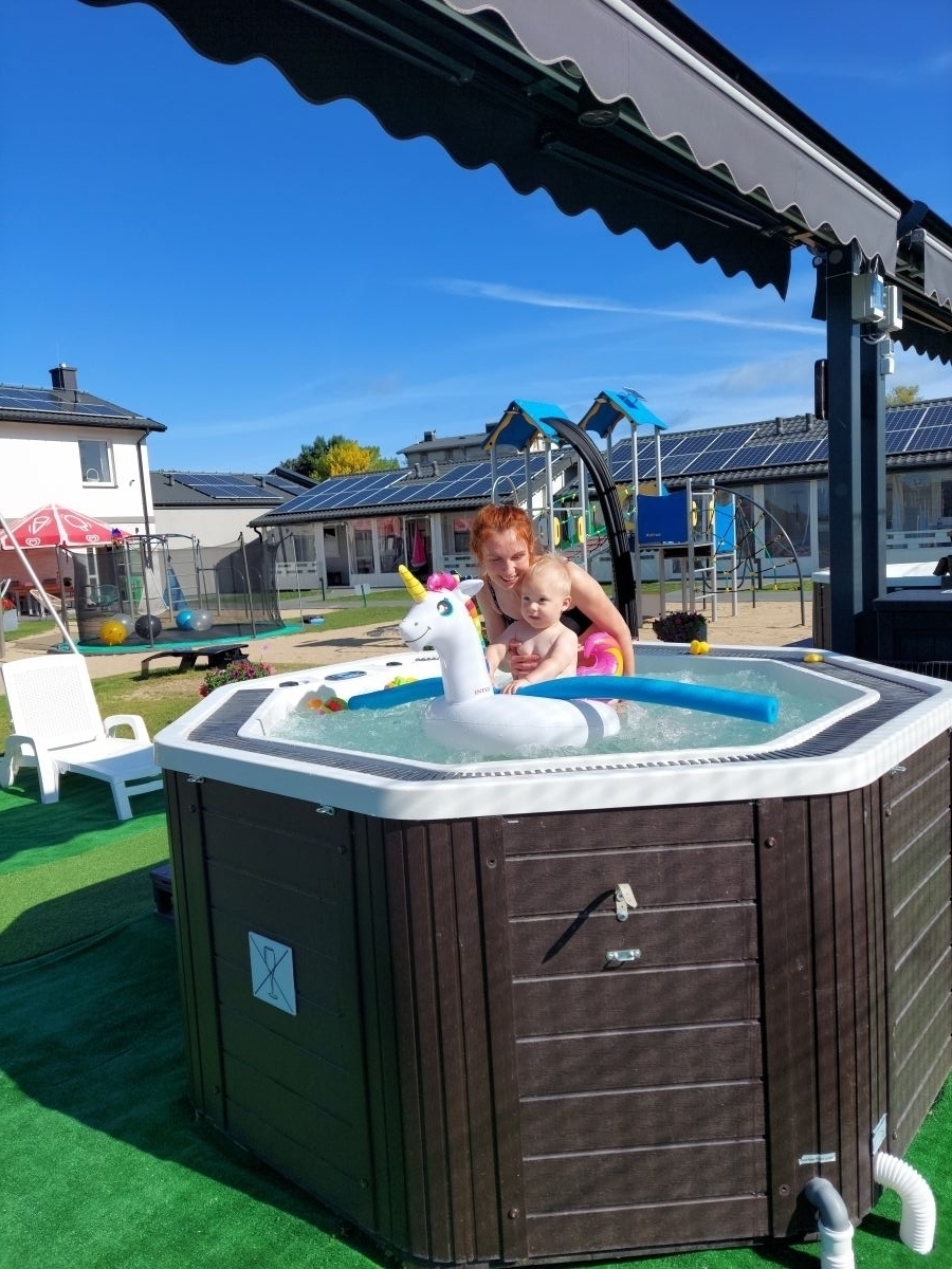 Podobała nam się bogata oferta rozrywek dla dzieci, zarówno tych mniejszych, jak i większych (rowery w różnych rozmiarach i formach, przyjazna sala zabaw dla maluchów, stół do ping ponga, piłkarzyki, cymbergaj, plac zabaw, trampoliny). Dorośli mogli skorzytać z dwóch jacuzzi, nawet w czasie deszczu. Domki przestronne, wyposażone we wszytsko co potrzebne, począwszy od suszarki do włosów, deski do prasowania, tostera, czajnika, mini podwieszanego siedziska bujanego dla dziec, a kończąc na wózku plażowym, parawanie, suszarce na pranie, i dużym grillu. Miejsce wielokulturowe, dzieci nawiązały pierwsze zagraniczne znajomości z kolegami z Niemiec, Czech. Nieznajomość języka nie była żadną przeszkodą, codziennie wspóLnie się bawili na boisku w resorcie, jeździli rowerami itp. Najmłodszy 4-latek przeżył pierwszą miłość. Brakowało jedynie nieco większego basenu dla dzieci.