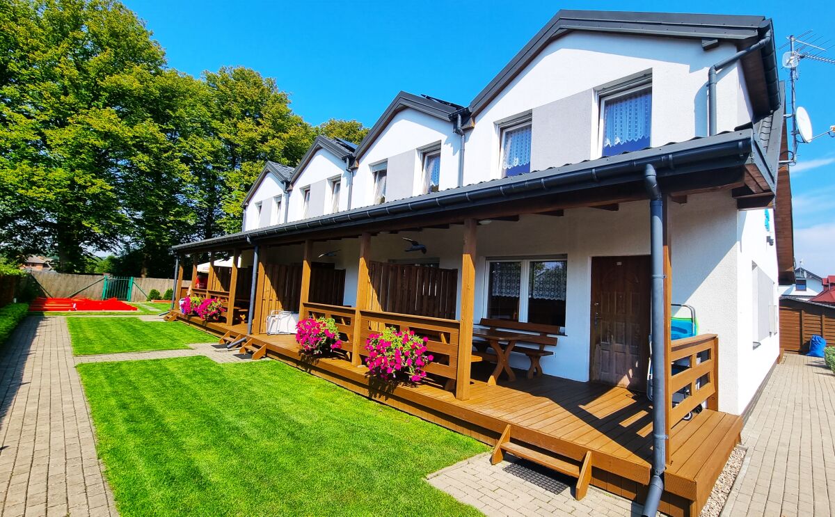 Przed każdym domkiem przygotowaliśmy teren zielony, na którym można rozstawić leżaki, pobawić się z dziećmi lub oddać się przyjemności grillowania.