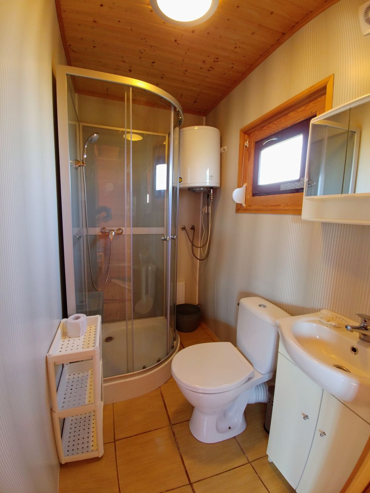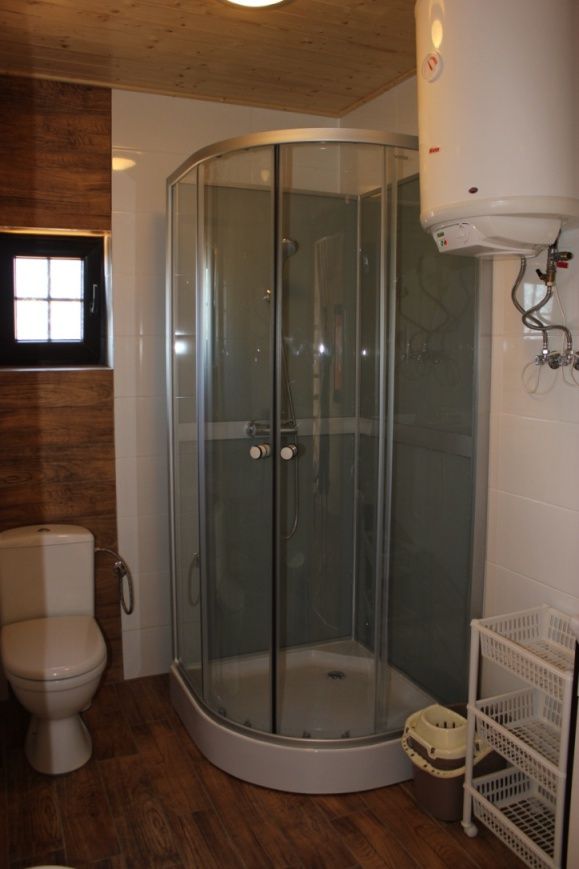 - Łazienka z pełnym węzłem sanitarnym, kabina z wysokim brodzikiem