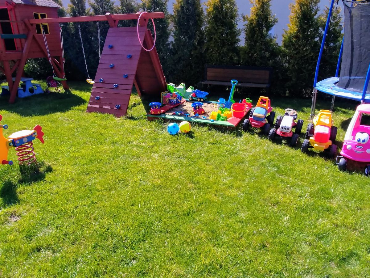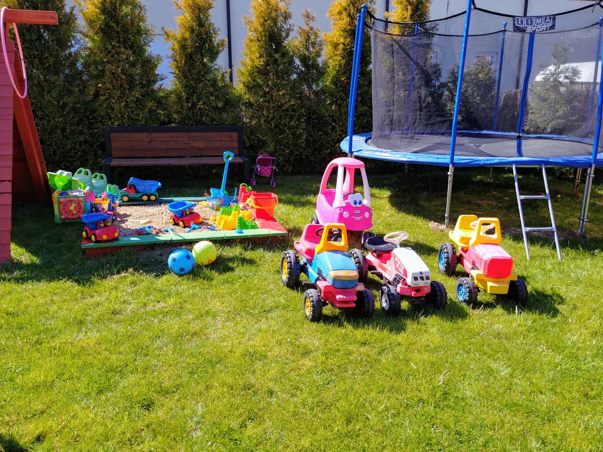 Trampolina, duży domek, ścianka wspinaczkowa, zjeżdżalnia, huśtawki, bujaki, piaskownica, rowerki dla dzieci i wiele innych zabawek :)