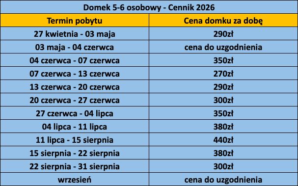 Do dyspozycji Gości oddajemy trzy domki drewniane (5-6 os.) oraz jeden domek ośmioosobowy - komfortowo urządzone z zadaszonym tarasem.