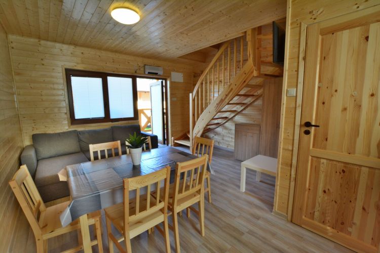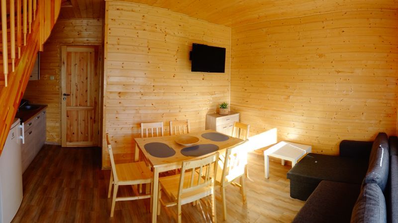 Wyposażenie domków Typu "A": Maksymalna liczba osób w domku Typu "A" to 6 PARTER sofa narożna z funkcją spania łazienka (kabina prysznicowa, toaleta, szafka z umywalką, lustro) tv Ława aneks kuchenny (lodówka, kuchenka elektryczna, czajnik elektryczny, naczynia, garnki, sztućce) PIĘTRO dwie oddzielnie sypialnie w jednej sypialni 1 łóżko małżeńskie 160 x 200 ( wersalka) w drugiej sypialni 2 łóżka pojedyncze szafki nocne pościel lampka nocna Parawan na plaże TARAS 6 krzeseł stolik ogrodowy grill