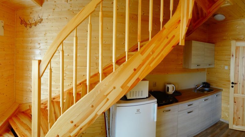 Wyposażenie domków Typu "A": Maksymalna liczba osób w domku Typu "A" to 8 PARTER sofa narożna z funkcją spania łazienka (kabina prysznicowa, toaleta, szafka z umywalką, lustro) tv Ława aneks kuchenny (lodówka, kuchenka elektryczna, czajnik elektryczny, naczynia, garnki, sztućce) PIĘTRO dwie oddzielnie sypialnie w jednej sypialni 1 łóżko małżeńskie 160 x 200 ( wersalka) w drugiej sypialni 2 łóżka pojedyncze szafki nocne pościel lampka nocna Parawan na plaże TARAS 6 krzeseł stolik ogrodowy grill