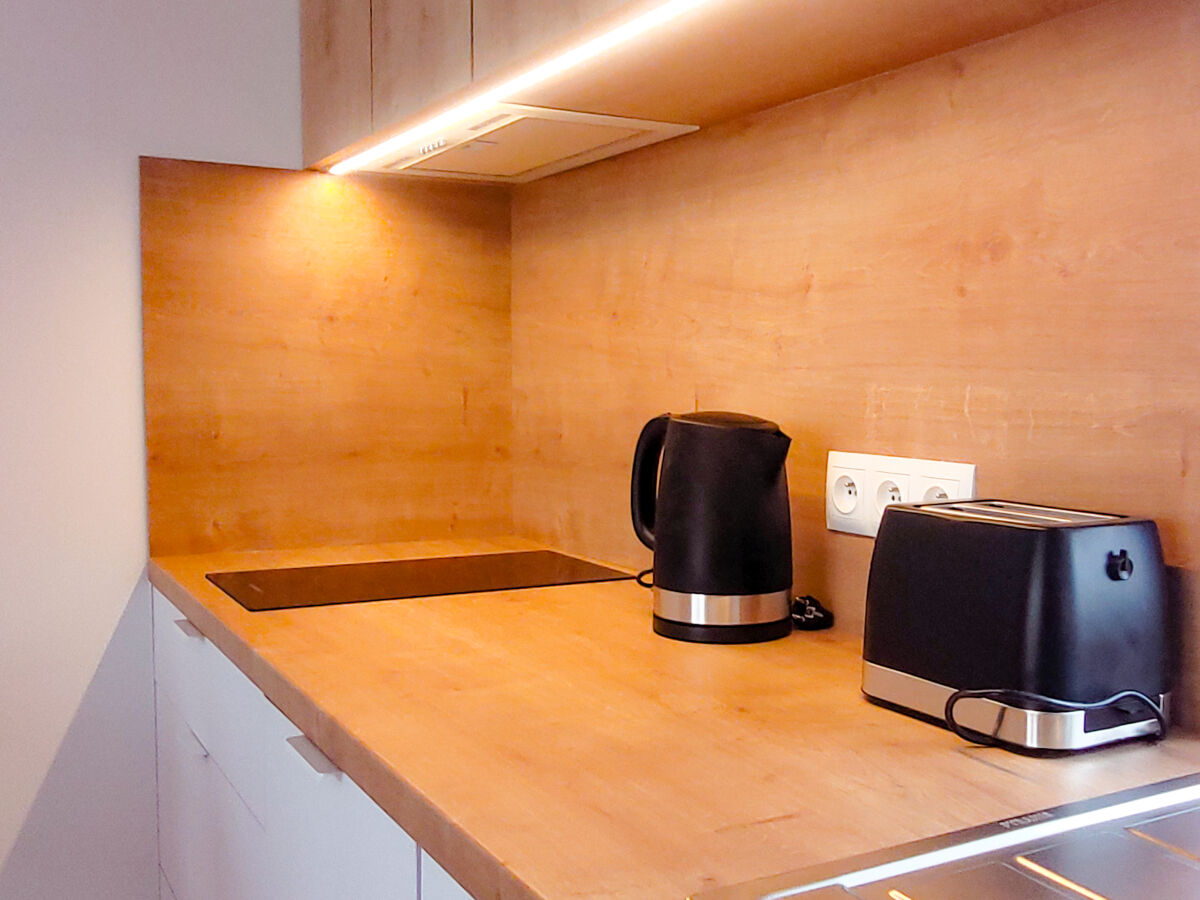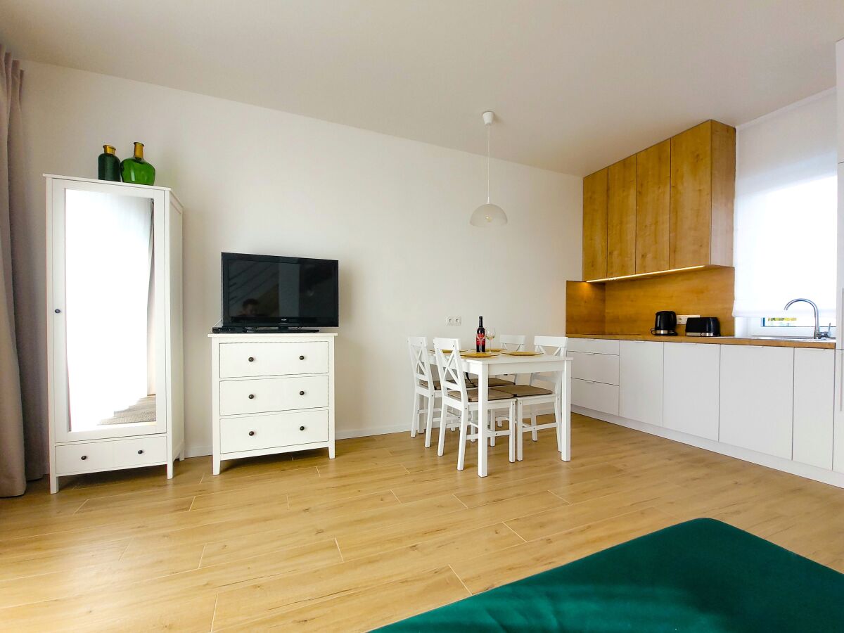 Mieszkanie ma 45 metrów kwadratowych na dwóch piętrach. Na parterze znajduje się salon z telewizorem z płaskim ekranem, WiFi (sieć komórkowa) i wygodną sofą - stołem jadalnym oraz aneks kuchenny ze zmywarką oraz piękna łazienka z kabiną prysznicową. Na piętrze znajdują się dwie piękne, jasne i przestronne sypialnie. Bardzo udany plan piętra zapewnia mnóstwo przestrzeni i komfortu. Dopełnieniem całości jest prywatne miejsce parkingowe bezpośrednio przed domem.