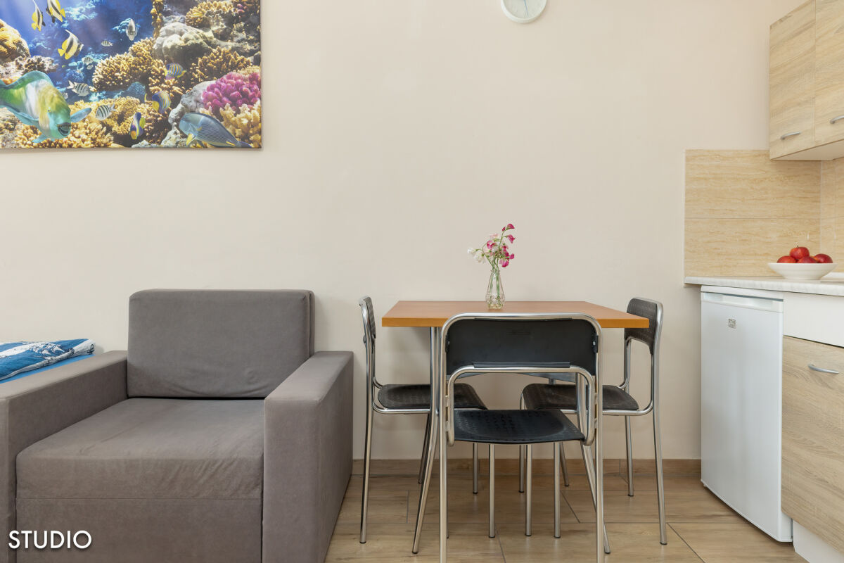 Studio to otwarte pomieszczenie (przeznaczone dla dwóch osób z możliwością dostawki dla jednej osoby) w którym znajduje łóżko małżeńskie, oraz rozkładana sofa z możliwością spania dla jednej osoby, płaski telewizor w pełni wyposażony aneks kuchenny i łazienka.