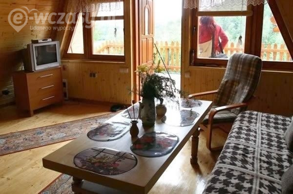 Domek posiada nowoczesne umeblowanie: salon - wersalka dwuosobowa, kominek, TV, radio, wyjście na taras - 16m2. Otwarta kuchnia. Prysznic, oddzielne WC, SAUNA.