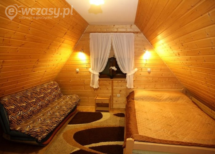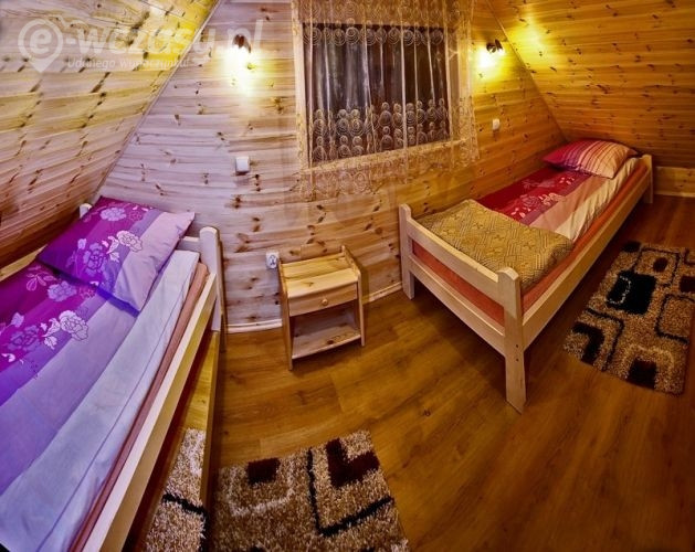 Na górze w domkach znajdują się dwie osobne sypialnie z podwójnym i pojedynczymi łóżkami. Na korytarzu szafa, zabezpieczenie nad schodami dla dzieci typu bramka, a na dole salon z kominkiem (umeblowanie kompletne - DVD, TV- cyfrowy Polsat), INTERNET.