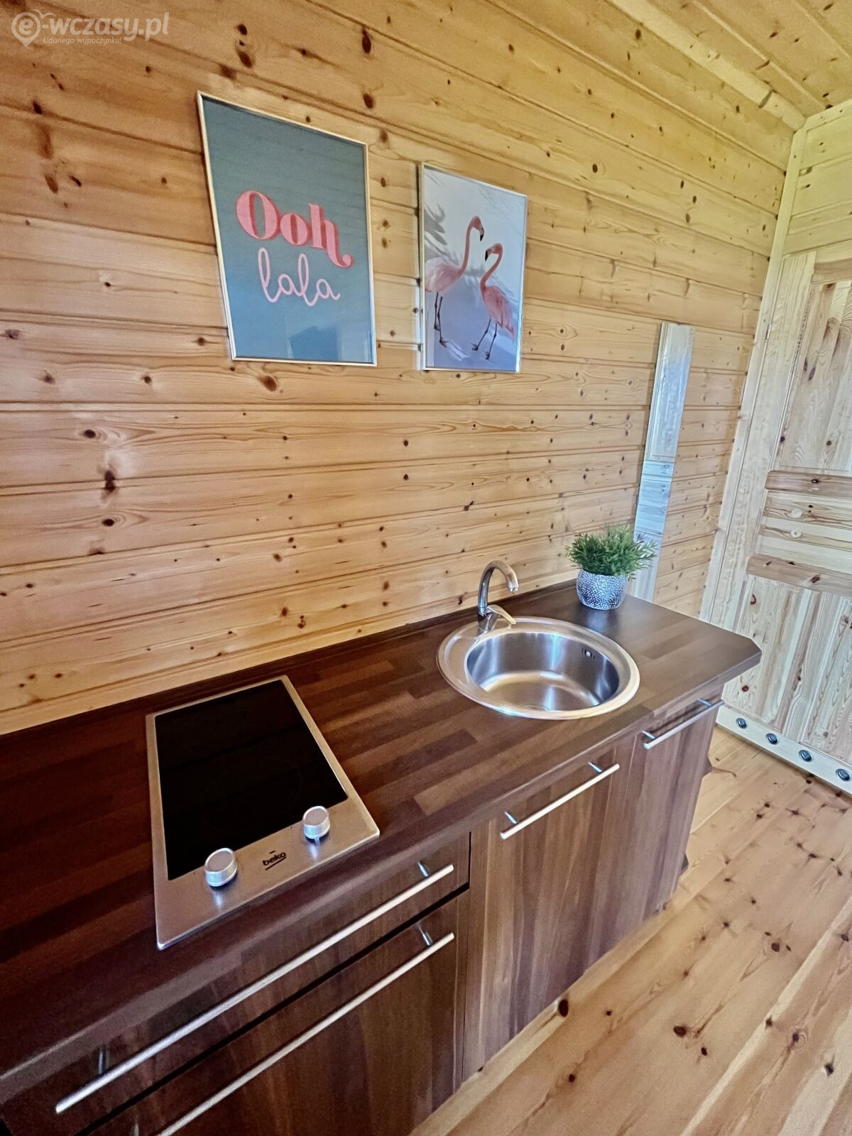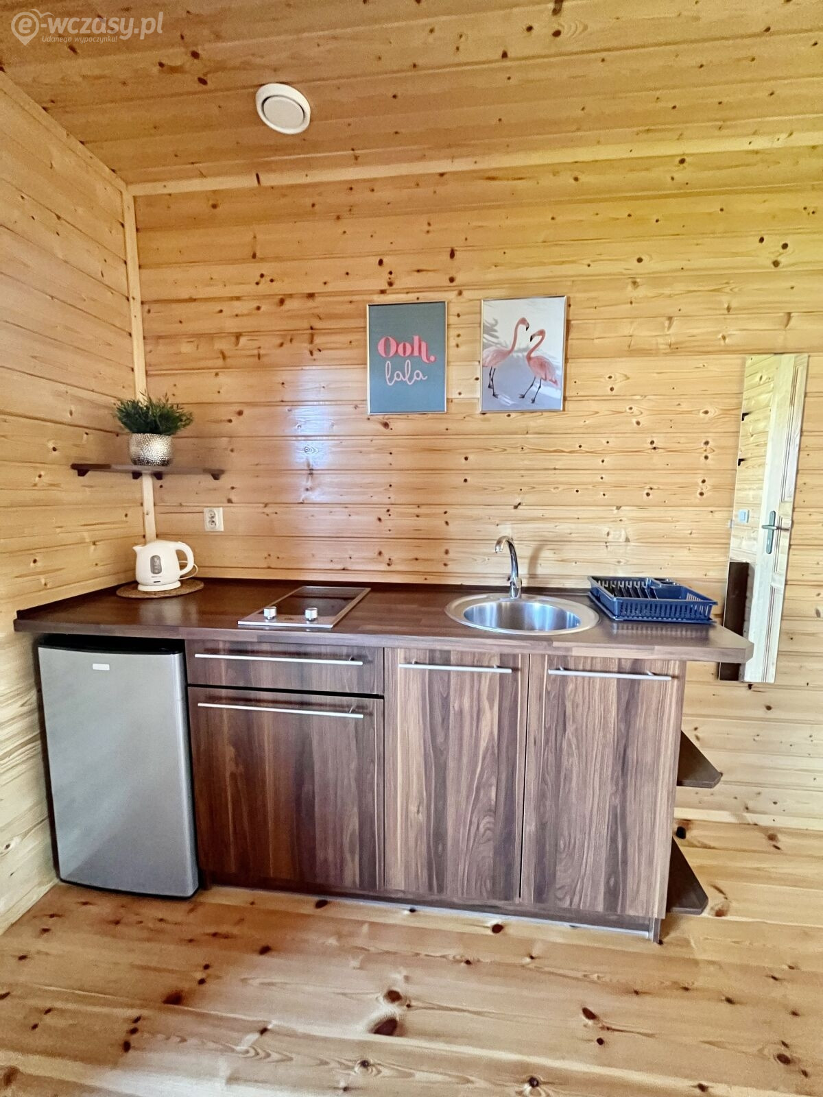 - Aneks kuchenny- wyposażony w elektryczną płytę, czajnik, naczynia kuchenne i stołowe oraz lodówkę.