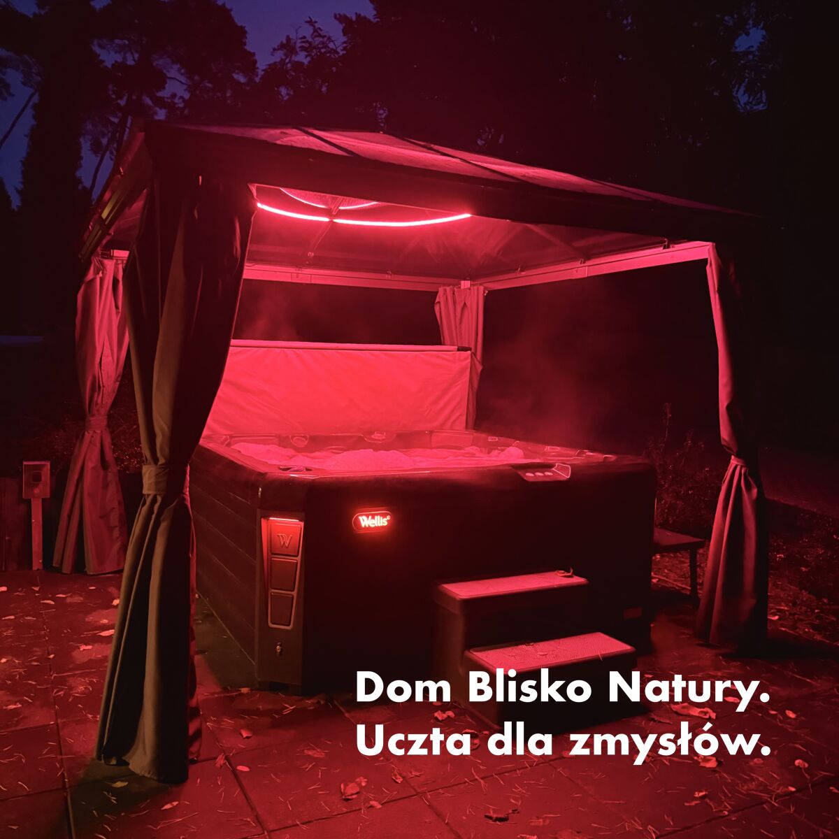 * prywatne jacuzzi premium marki Wellis z ogrzewaniem elektrycznym, ogrodowa sauna fińska marki KLAFS z ogrzewaniem elektrycznym.