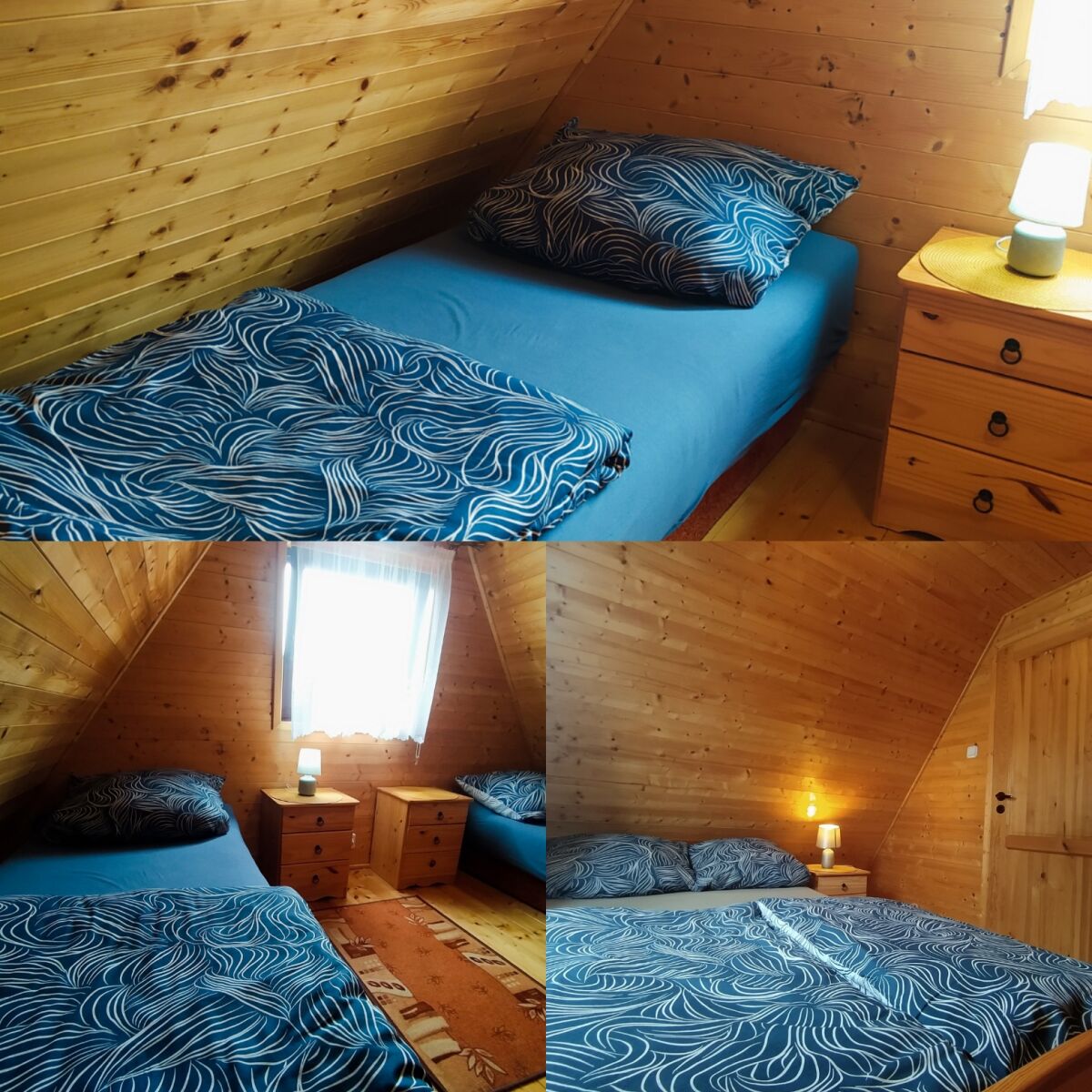 - dwie sypialnie (do których prowadzą łagodne schody): pierwsza z 2 os. łóżkiem małżeńskim, komodą i szafką nocną, druga z dwoma oddzielnymi tapczanami i 2 szafkami nocnymi;