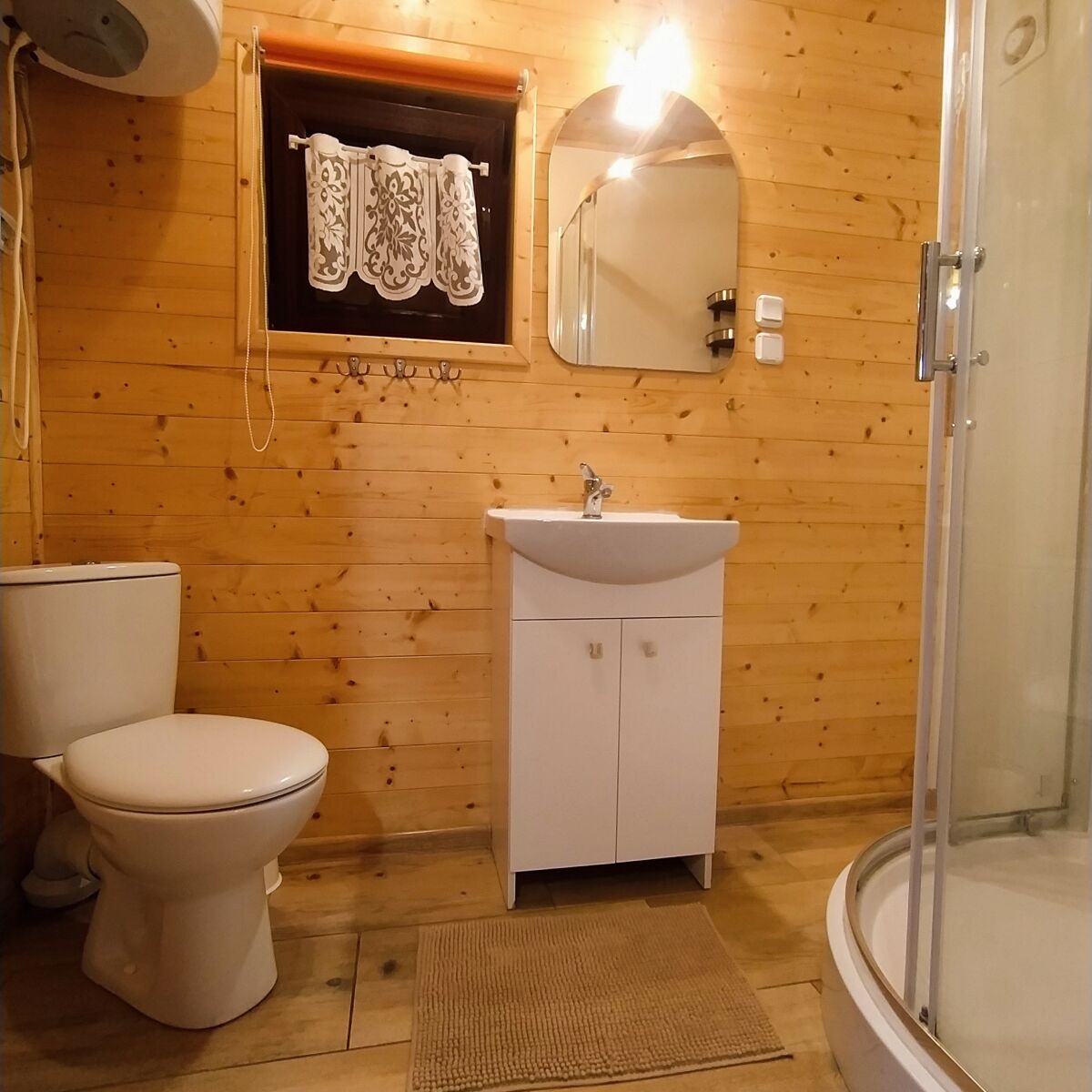 - łazienka (prysznic, wc szafka z umywalką, lustro, wieszaki);