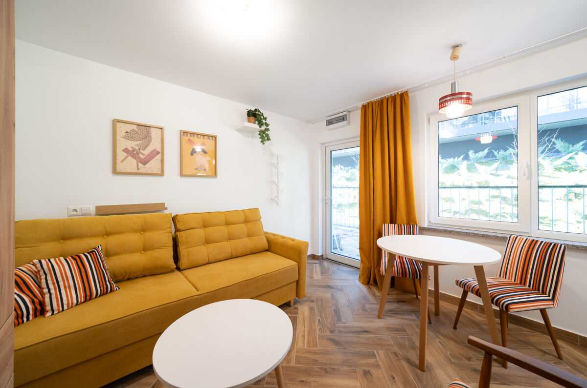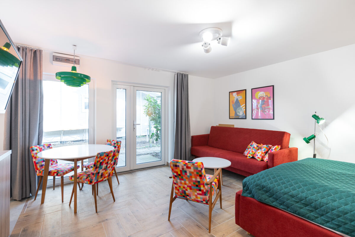 A1 -> domki 2-pokojowe (do 4 osób) z wyposażonym aneksem kuchennym, łazienką, TV i WiFi. Przed domkiem znajduje się taras z meblami ogrodowymi.