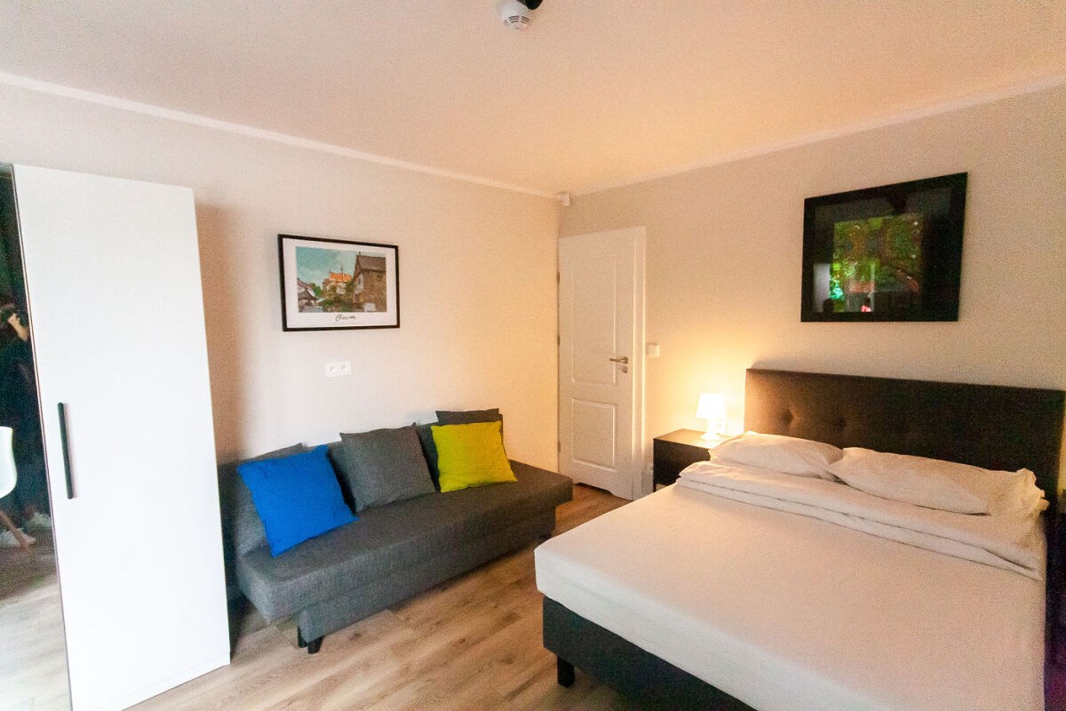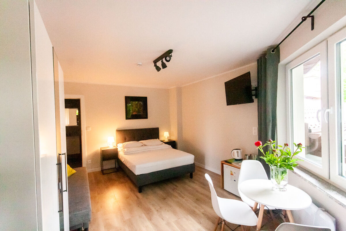 Pokój Studio 2 pokojowe - budynek B - są to 2 pokoje ze wspólnym korytarzem oraz 2 łazienki z pełnym węzłem sanitarnym, znajdujące się na piętrze budynku B. Ponadto studio posiada, TV, Wi-Fi, lodówkę, czajnik elektryczny, naczynia stołowe. Przed wejściem do studia znajdują się meble ogrodowe (stolik + 2 krzesła).