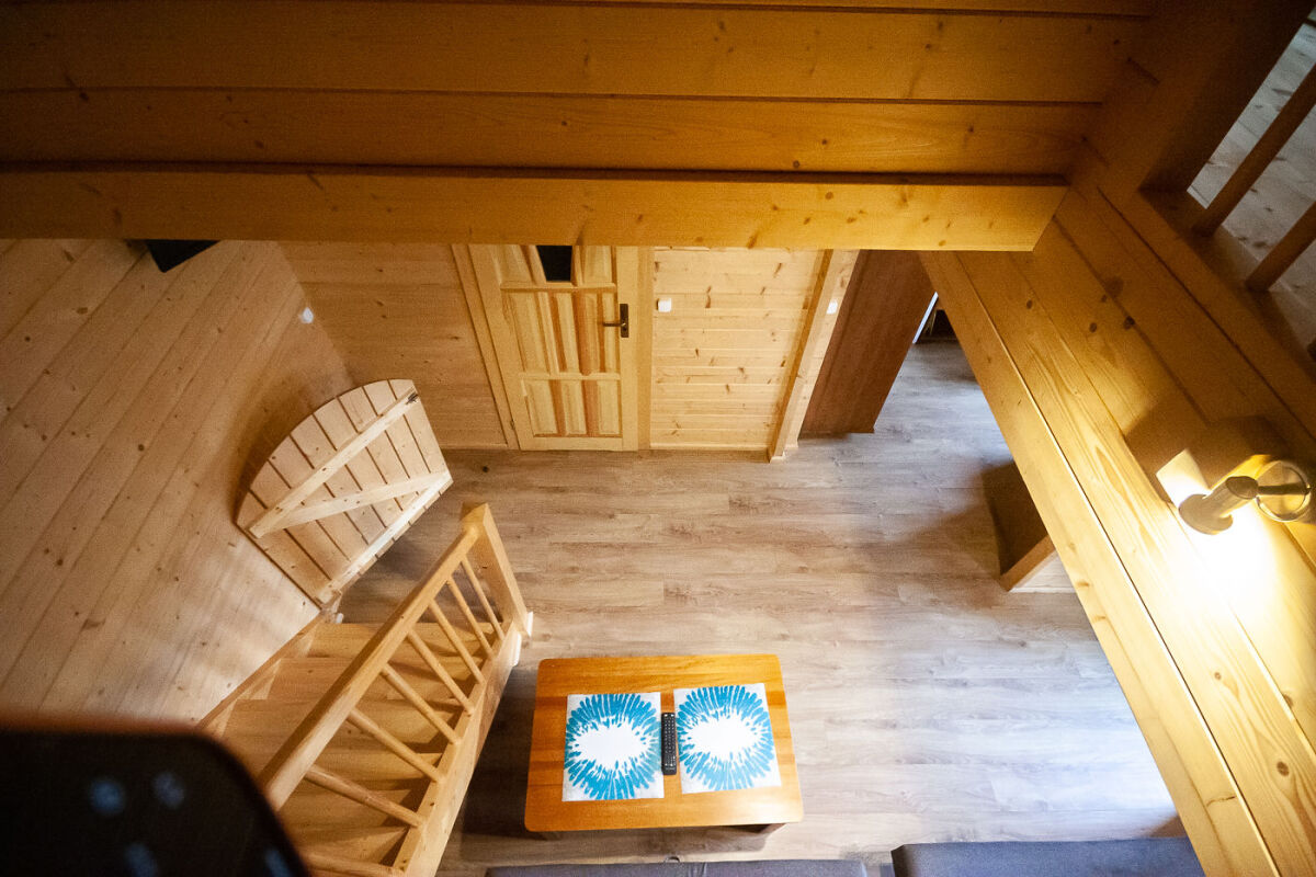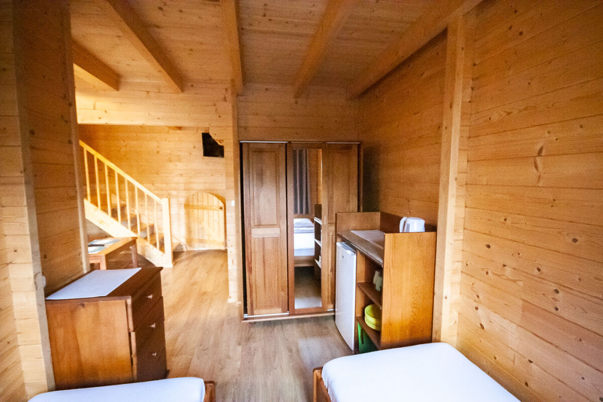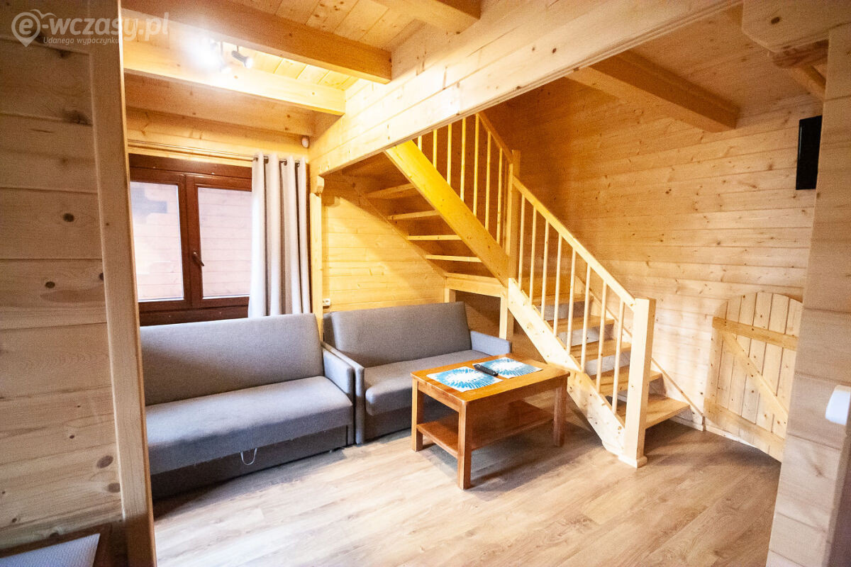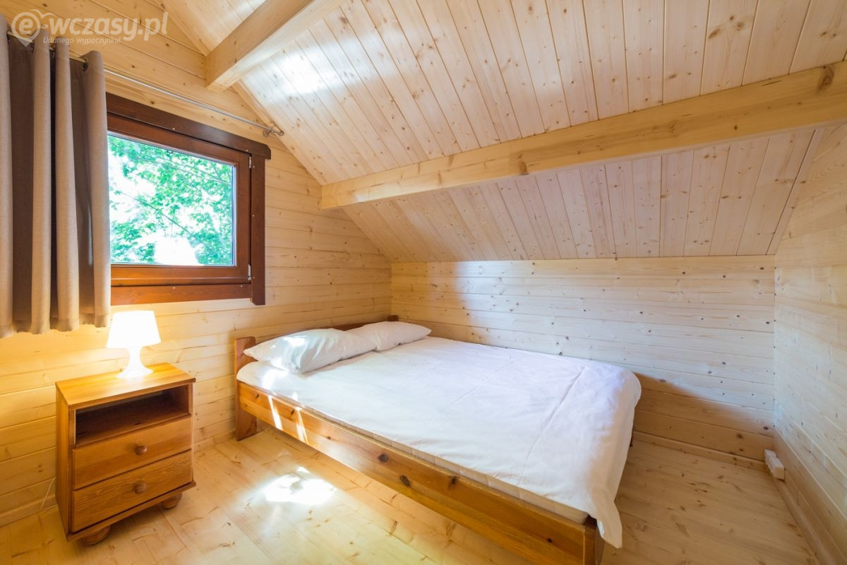 Domek piętrowy wolnostojący - 6-8 osobowy o powierzchni ok. 50 m², komfortowo wyposażony. Na dolnej kondygnacji jest łazienka, telewizor LCD, Wi-Fi, lodówka, czajnik elektryczny, naczynia stołowe, stół kawowy, dwa łóżka pojedyncze oraz rozkładana kanapa 2-osobowa. Na piętrze są dwa pokoje, jeden w formie antresoli, drugi zamykany. Przed domkiem jest weranda z meblami ogrodowymi (stolik + 4 krzesła).