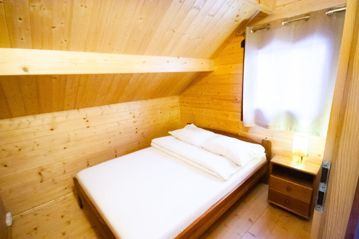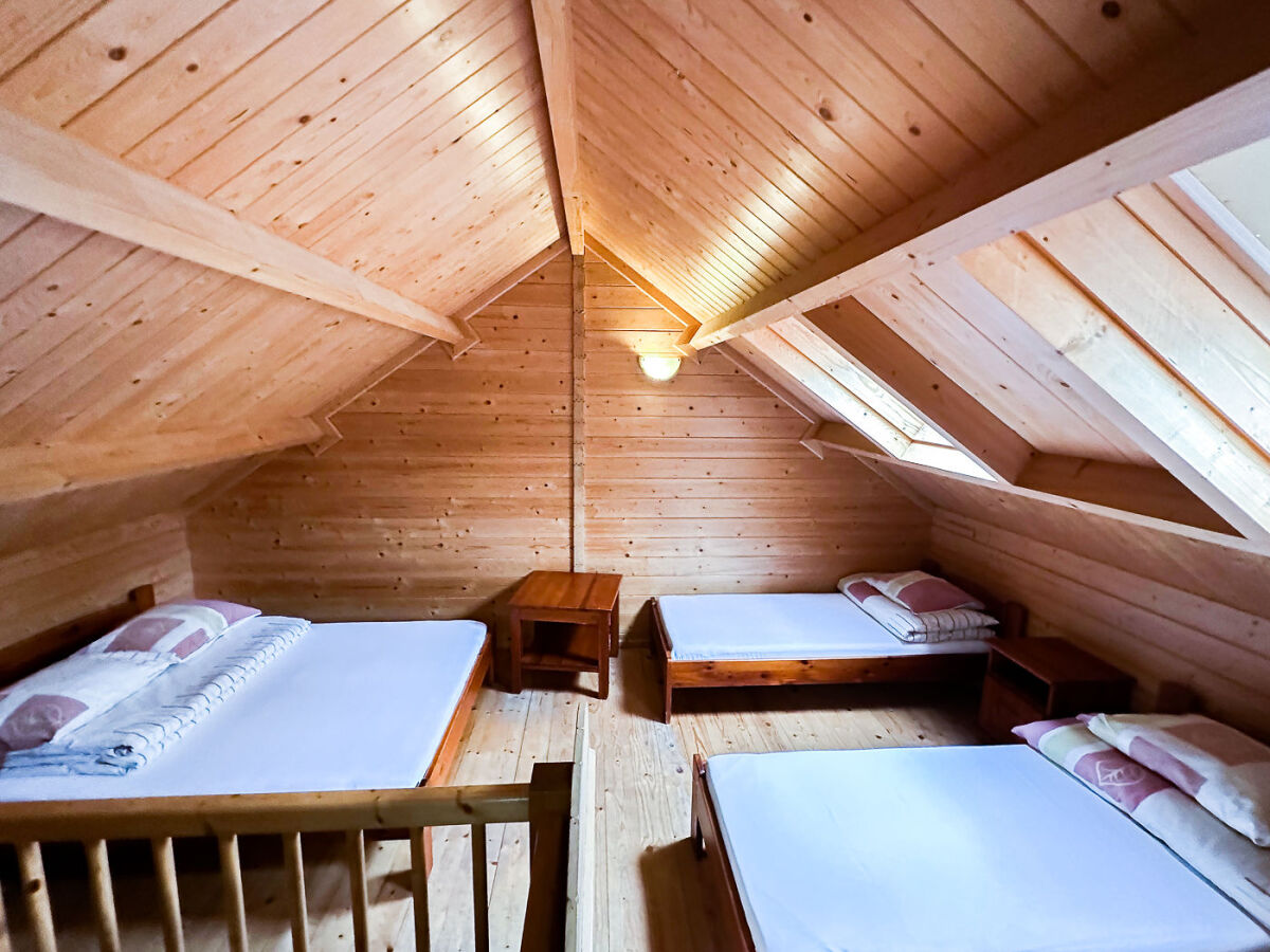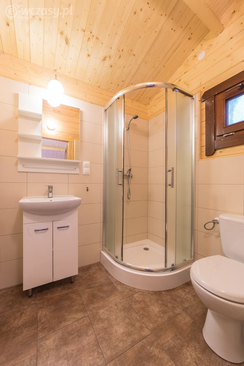 Domek piętrowy wolnostojący - 6-8 osobowy o powierzchni ok. 50 m², komfortowo wyposażony. Na dolnej kondygnacji jest łazienka, telewizor LCD, Wi-Fi, lodówka, czajnik elektryczny, naczynia stołowe, stół kawowy, dwa łóżka pojedyncze oraz rozkładana kanapa 2-osobowa. Na piętrze są dwa pokoje, jeden w formie antresoli, drugi zamykany. Przed domkiem jest weranda z meblami ogrodowymi (stolik + 4 krzesła).