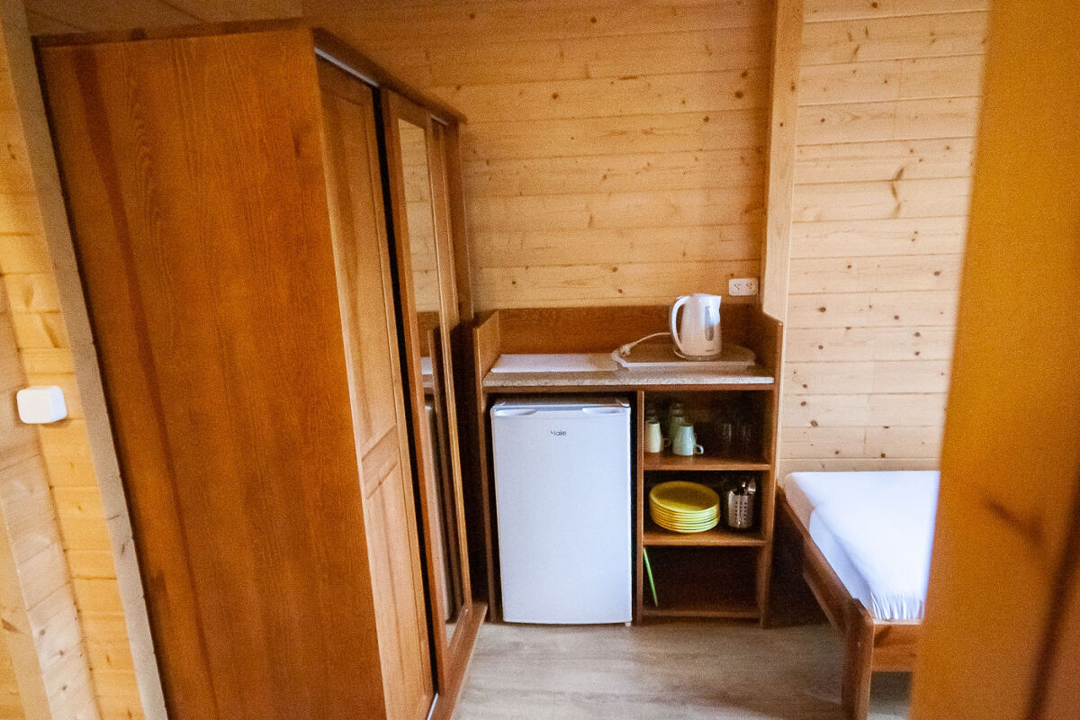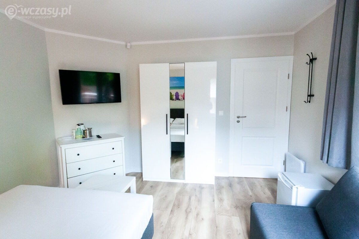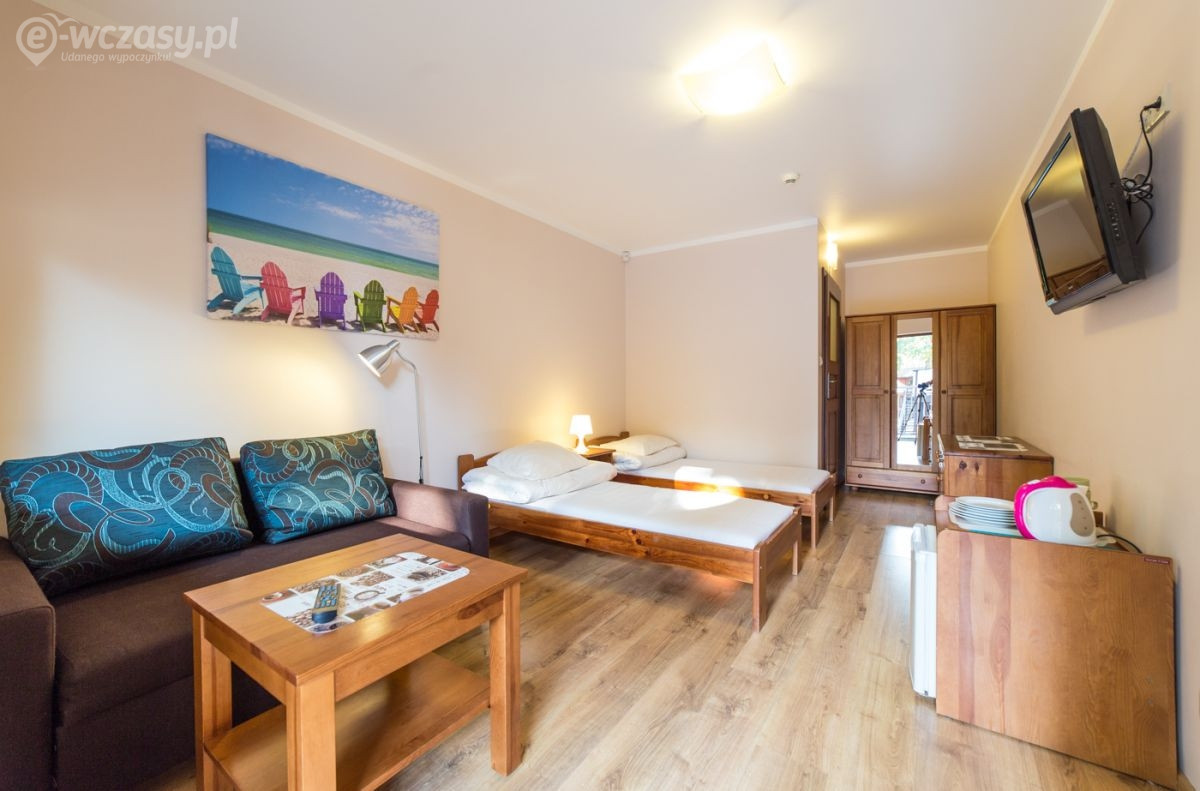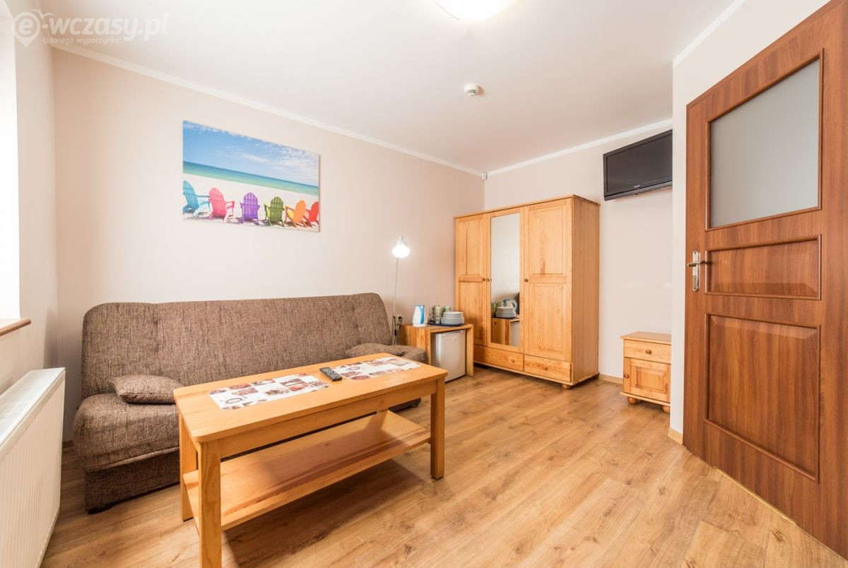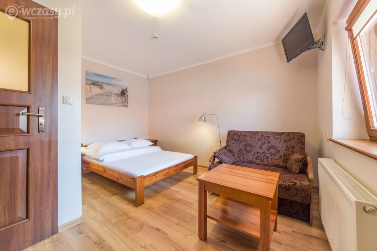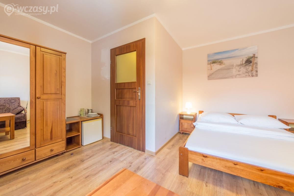 Pokój w domku typu Bliźniak - jeden domek - dwa niezależne wejścia, pokój 2-3 osobowy o powierzchni ok. 15 m². Komfortowo wyposażony w łazienkę, TV-SAT, Wi-Fi, lodówkę, czajnik elektryczny, naczynia stołowe. Przed domkiem znajdują się meble ogrodowe (stolik + 2 krzesła). Domki położone są najbliżej wyjścia nad morze.