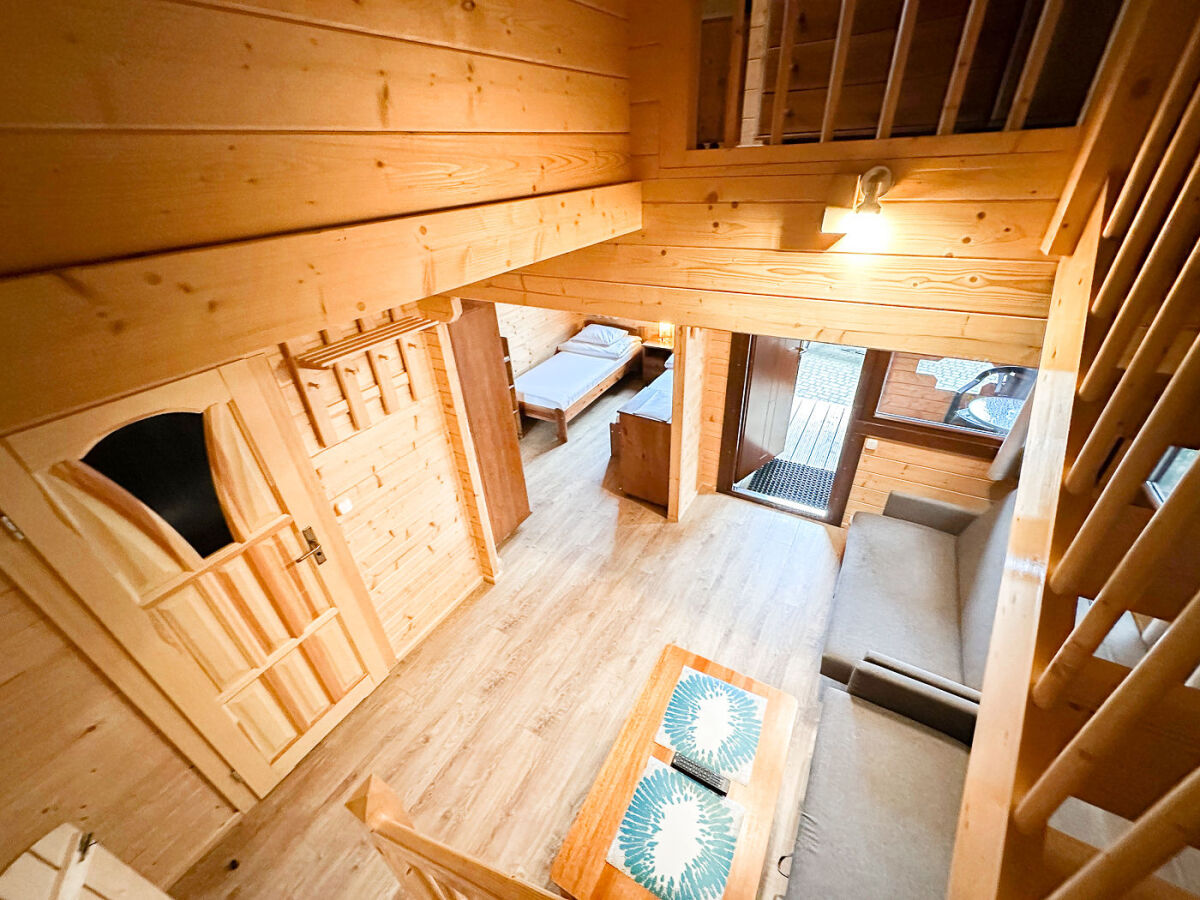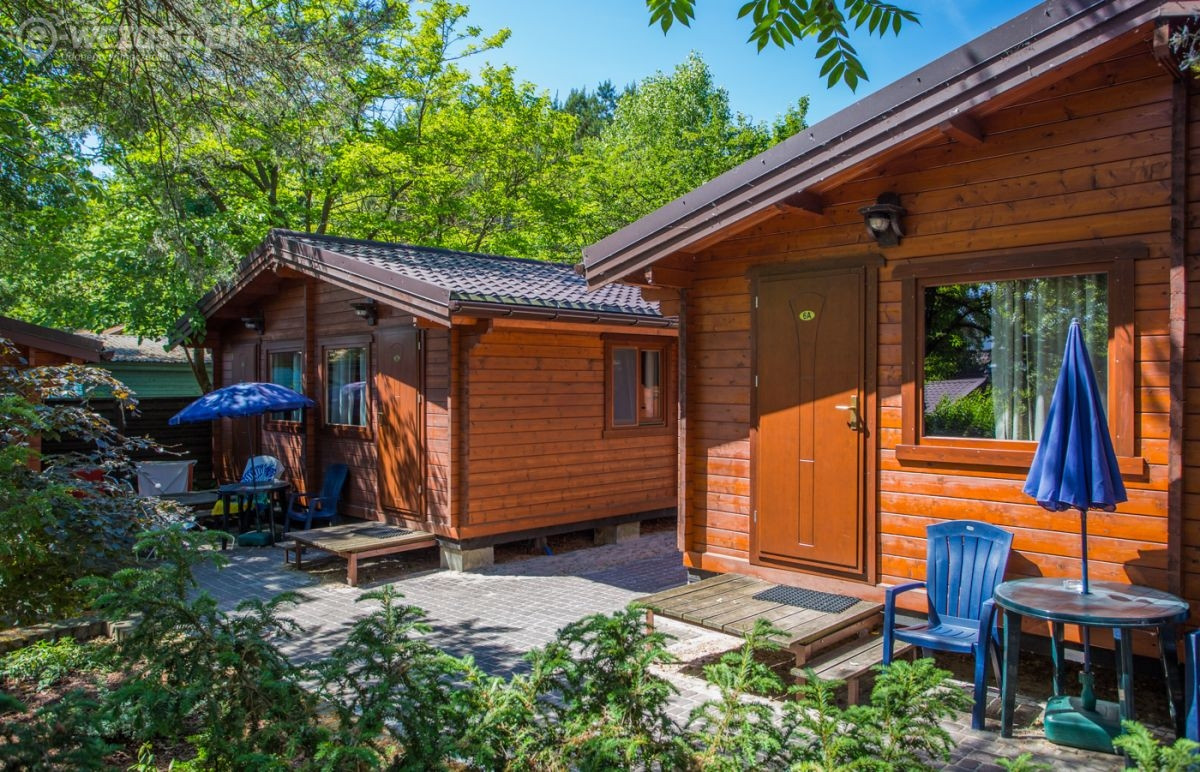 Domek piętrowy typu Bliźniak - 4-5 osobowy o powierzchni ok. 40 m², w zabudowie bliźniaczej lub szeregowej, składa się z parteru i piętra. Na dolnej kondygnacji znajduje się łazienka, telewizor LCD, Wi-Fi, lodówka, czajnik elektryczny, naczynia stołowe, stół kawowy, fotel oraz rozkładana wersalka 2-osobowa. Górna kondygnacja jest w formie antresoli. Przed domkiem jest weranda z meblami ogrodowymi (stolik + 2 krzesła).